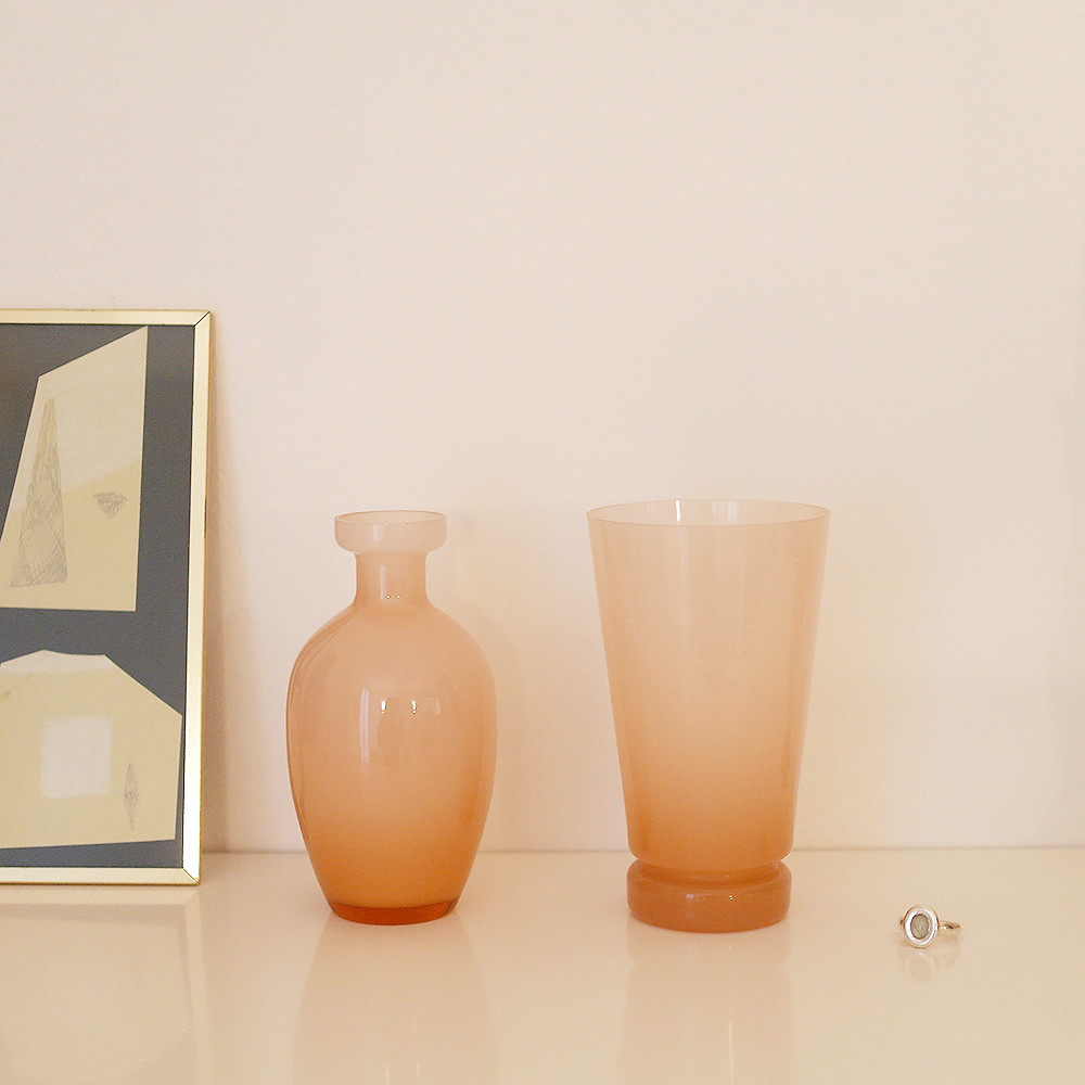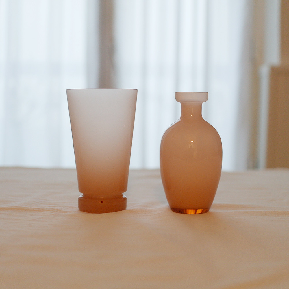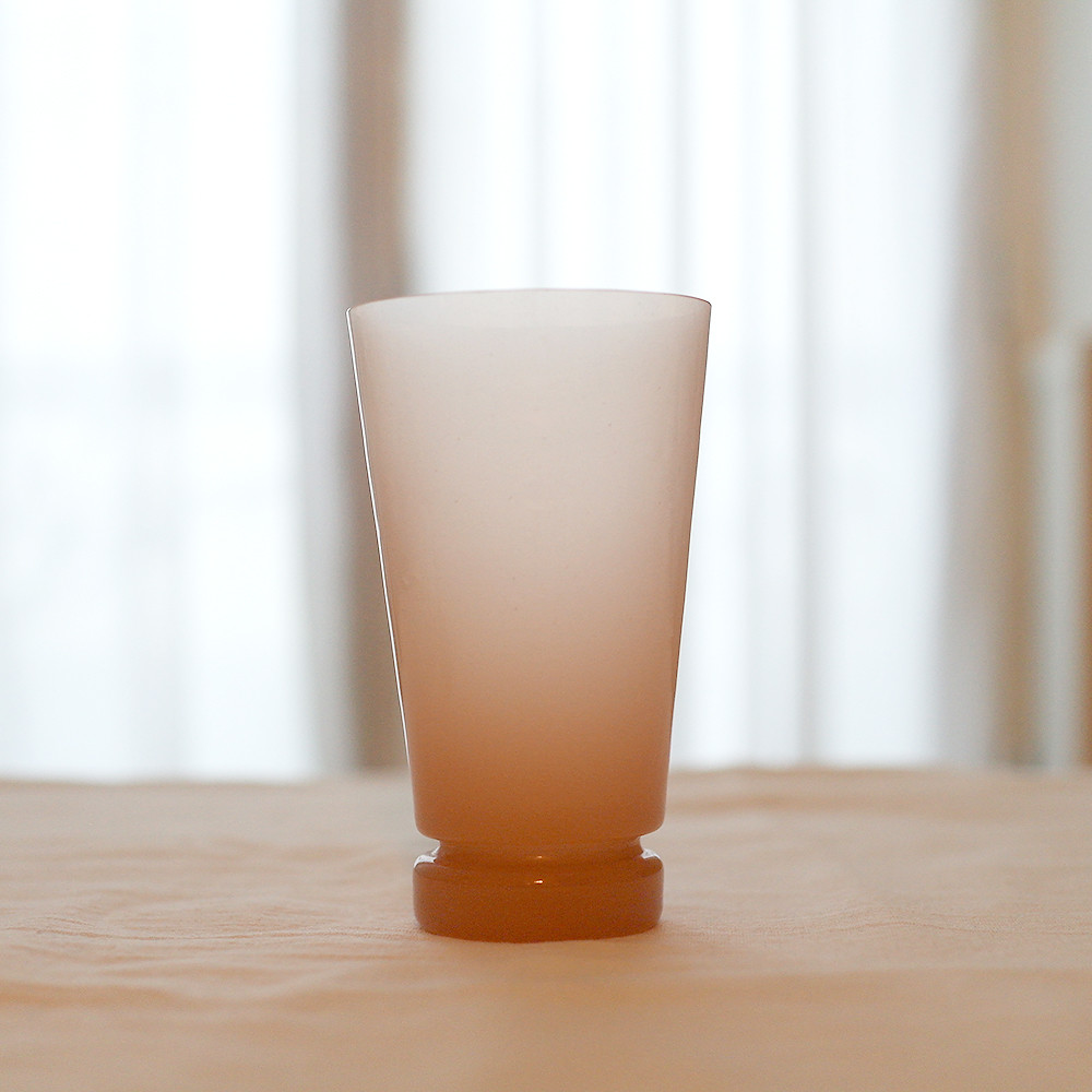 오팔린으로 만들어진 복숭아 빛 욕실용 유리세트입니다.
