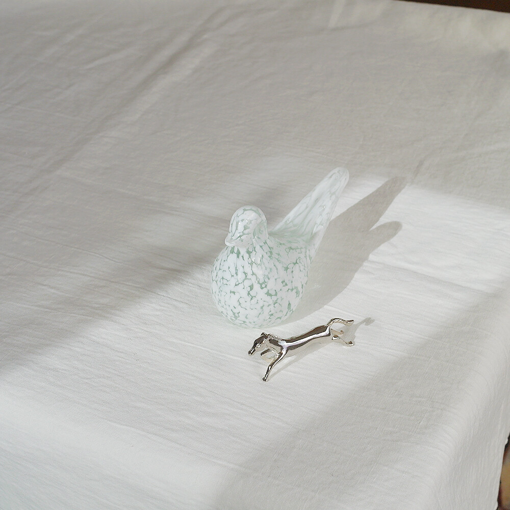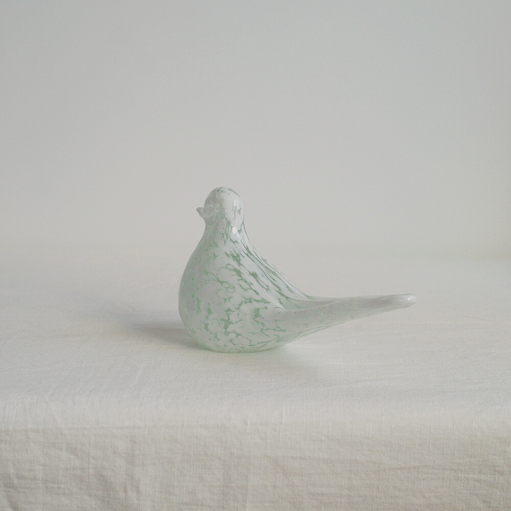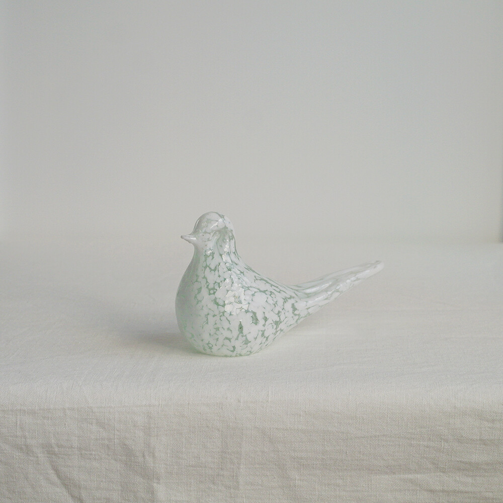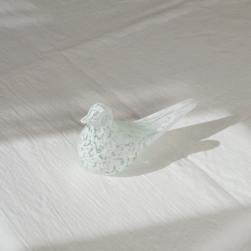 푸른 빛이 도는 유리에 하얀색 안료로 즉흥적인 패턴을 표현한 비둘기 모양의 유리 오브제 입니다.