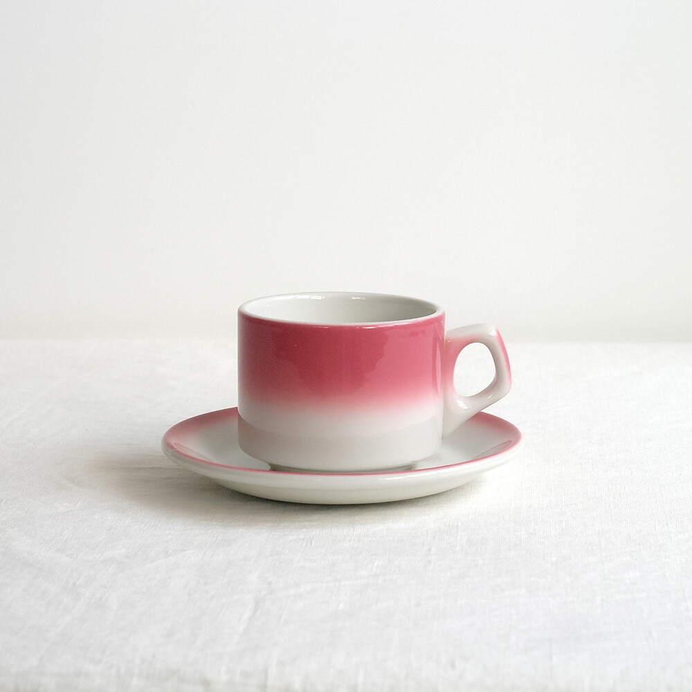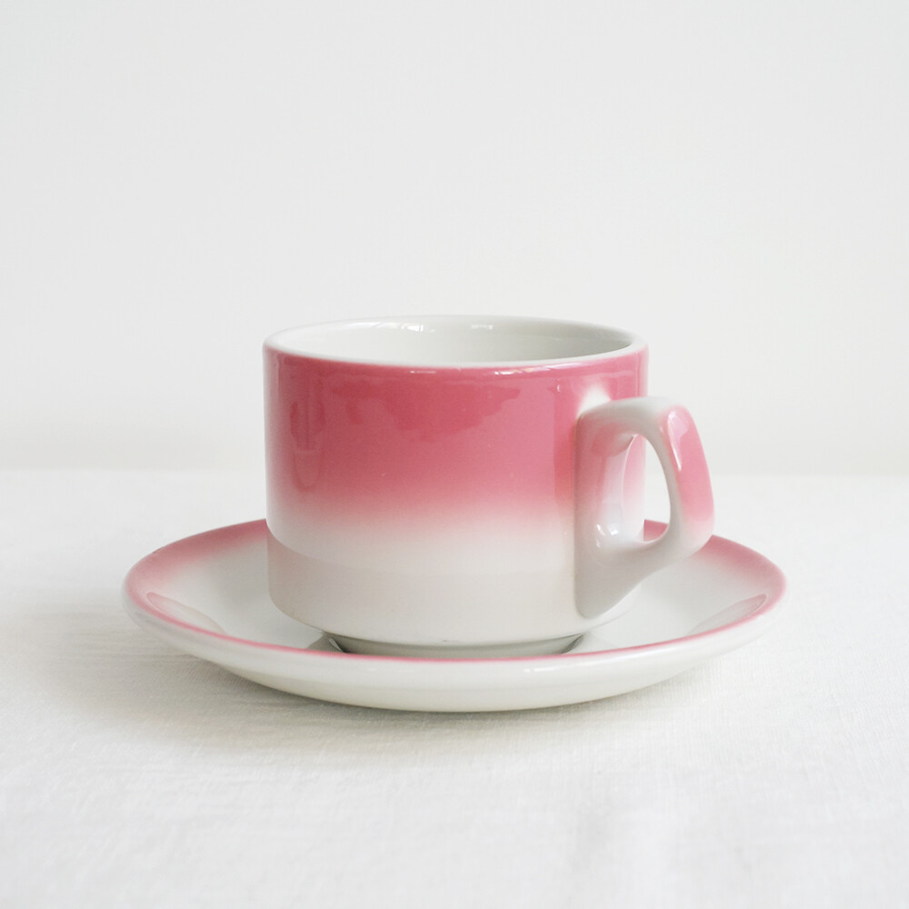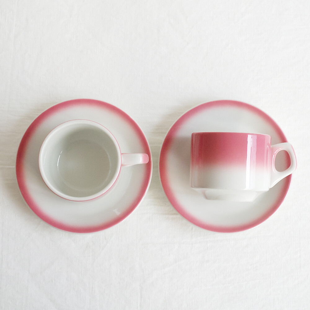 짙은 매홍빛의 그러데이션으로 컵의 바디부분과 손잡이에 포인트를 준 찻잔 세트 입니다.