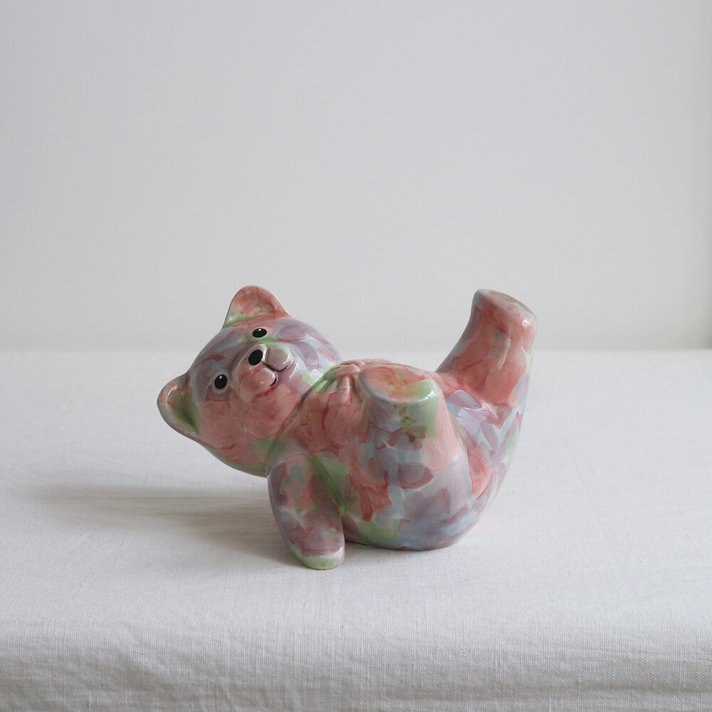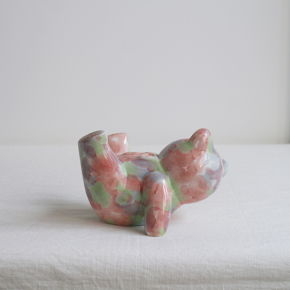 누워있는 테디베어 형태에 맑은 명도의 퍼플과 블루, 옐로그린 컬러를 큼직한 붓터치로 채색하였습니다.