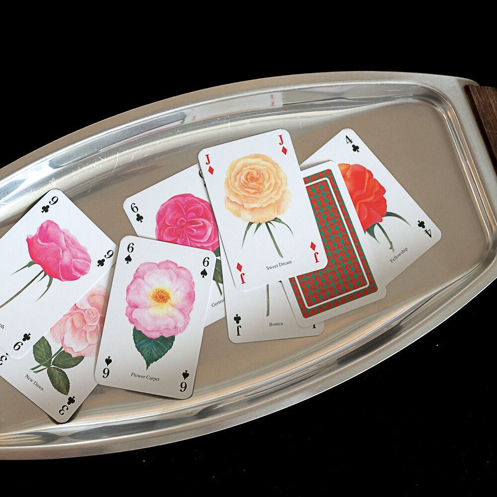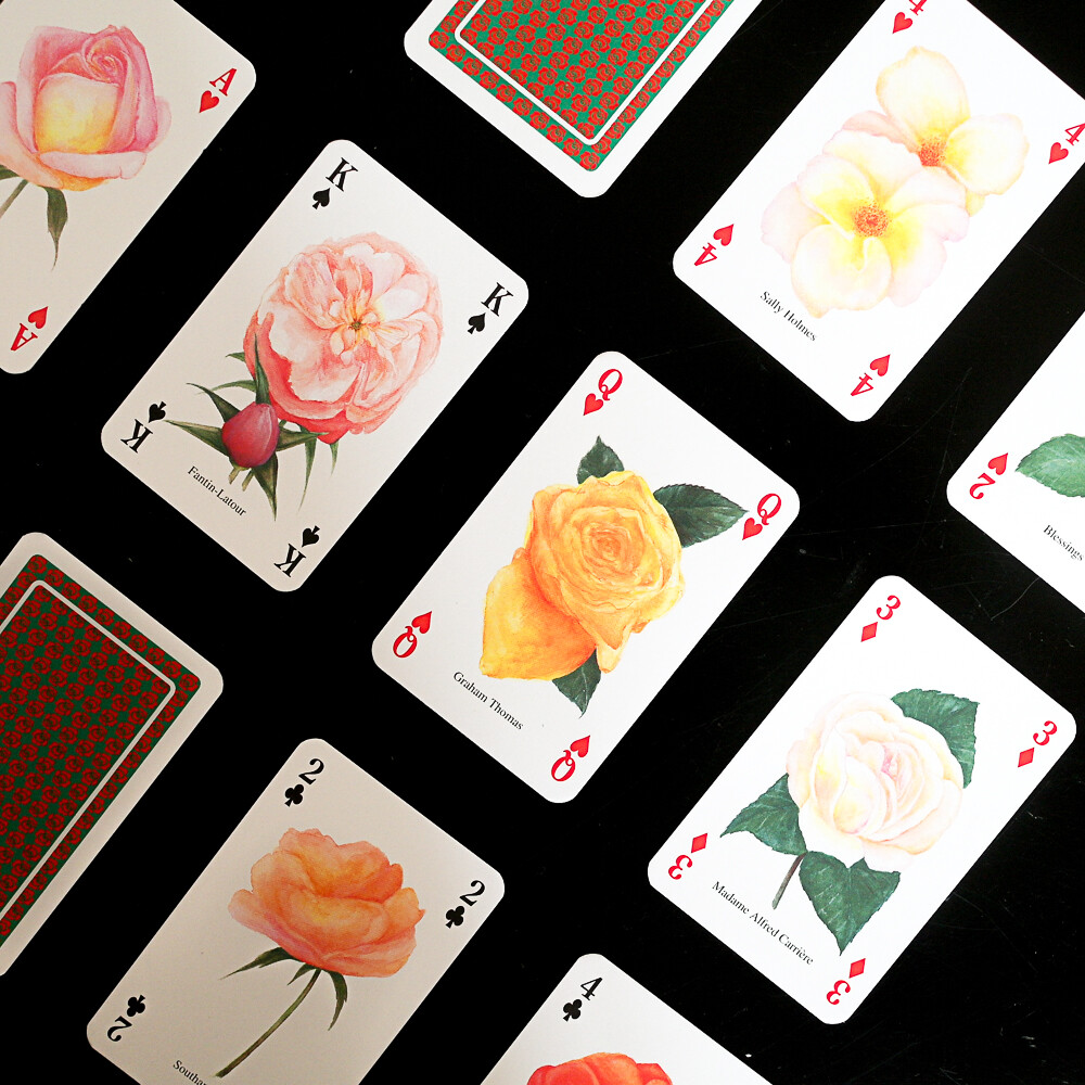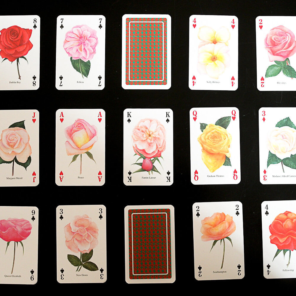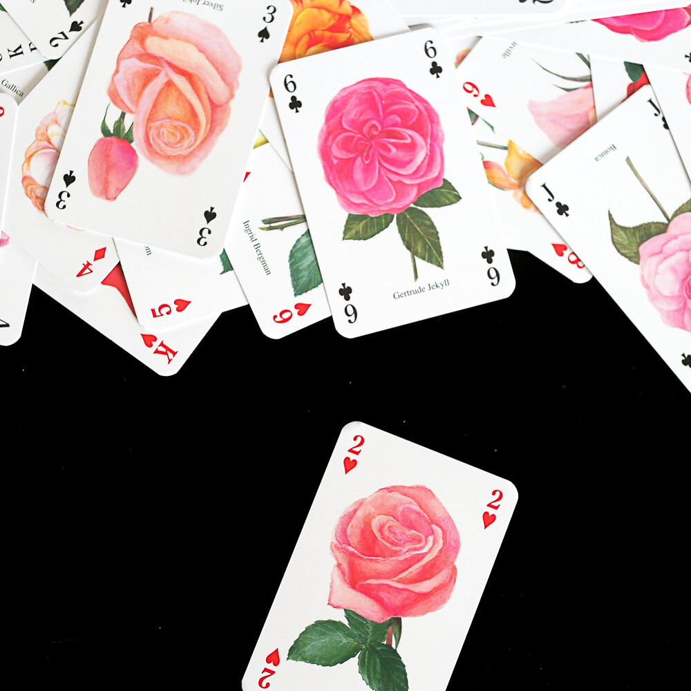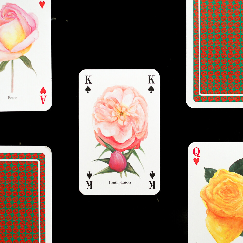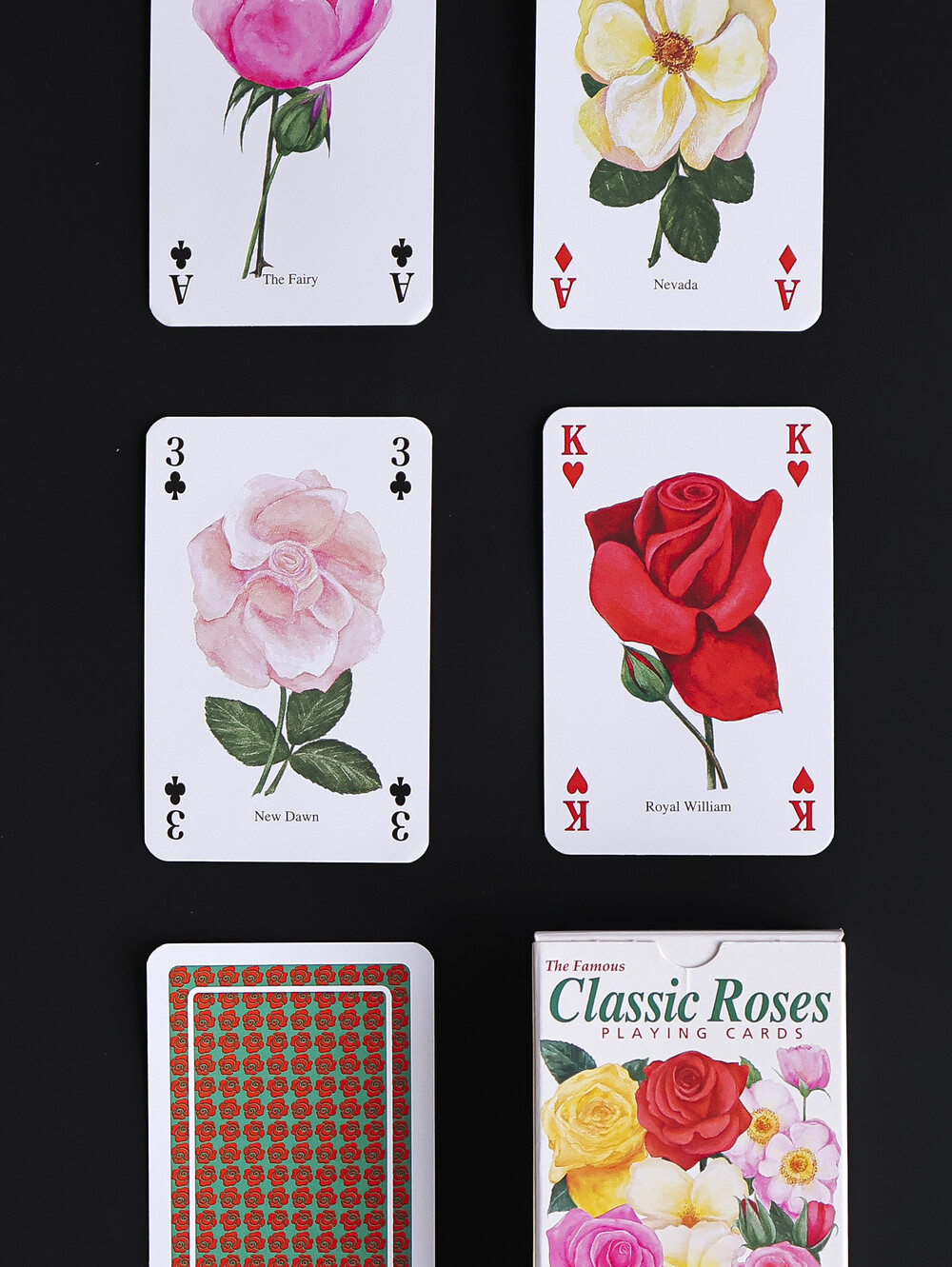 카드 놀이 데크는 가장 유명한 고전 및 현대 장미 54송이를 보여줍니다.