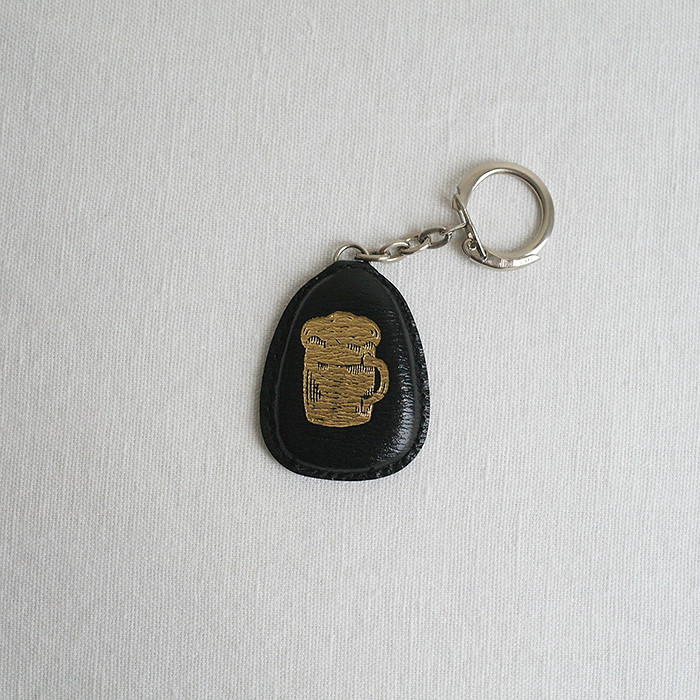 거품이 가득한 맥주 그림이 그려져 있는 도톰한 열쇠 고리 입니다.