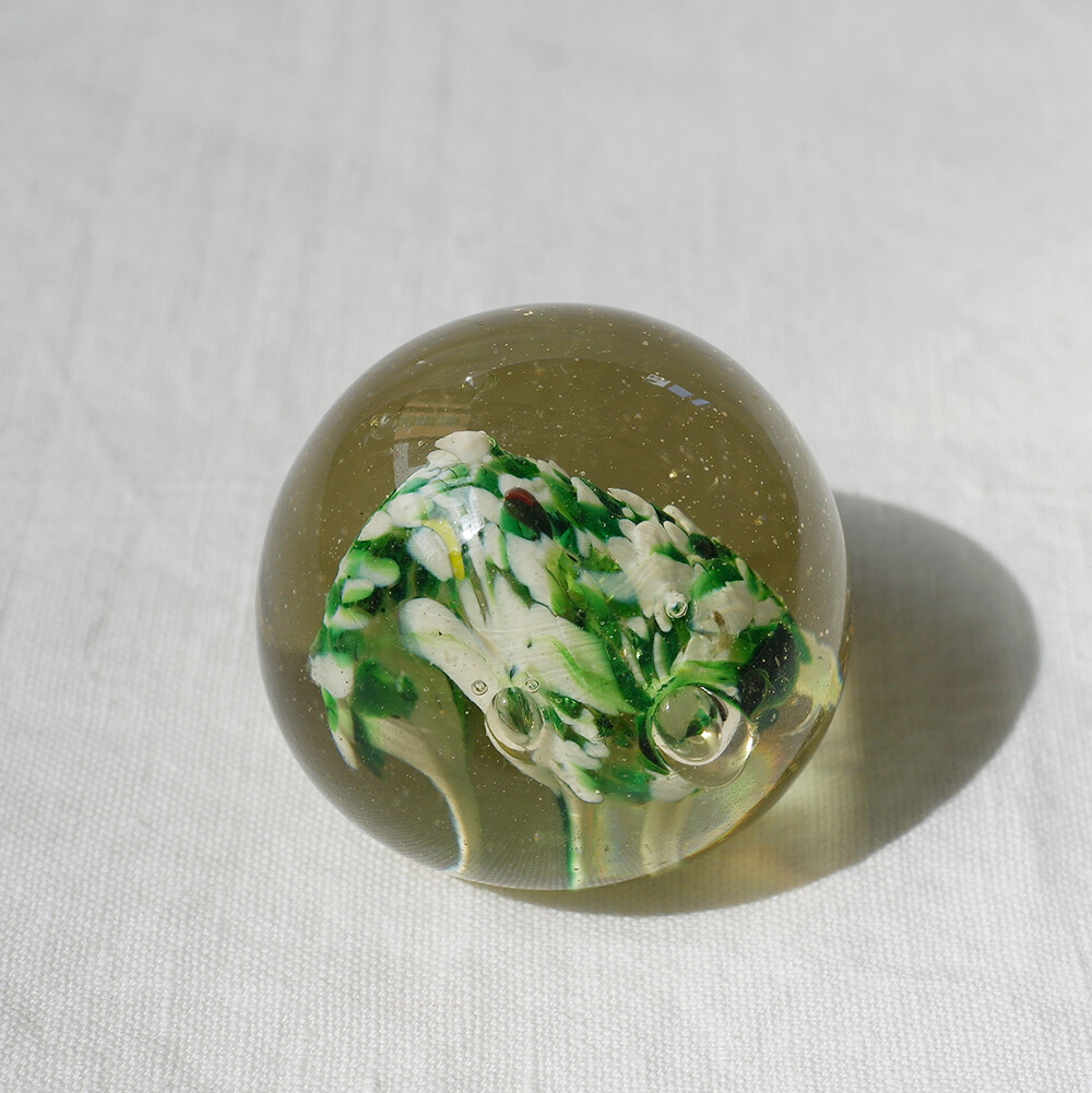작은 사이즈의 금빛 유리 안에 초록빛의 화산이 폭발하는 듯한 공예가 들어있는 유리문진 입니다.