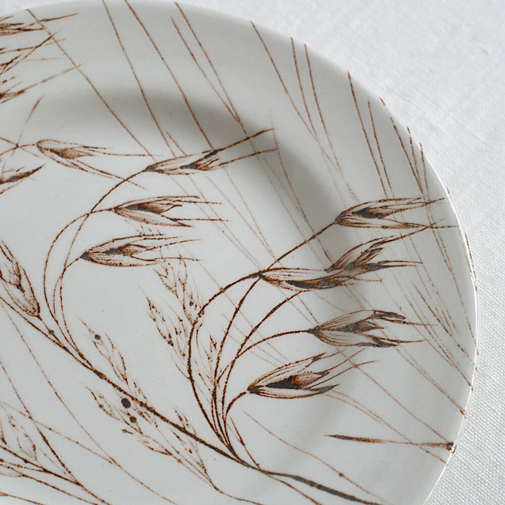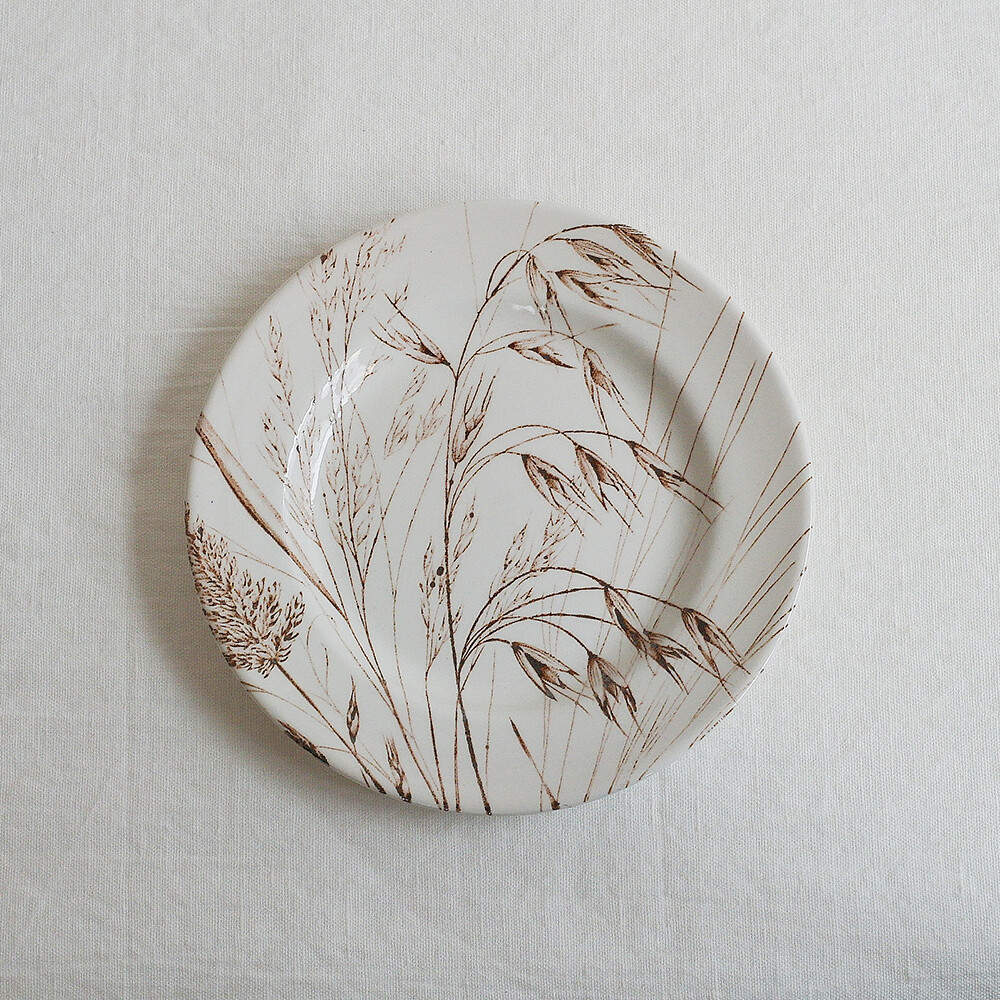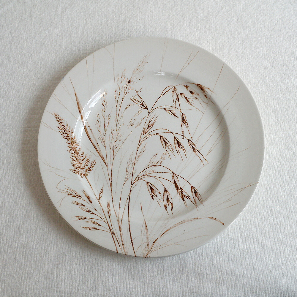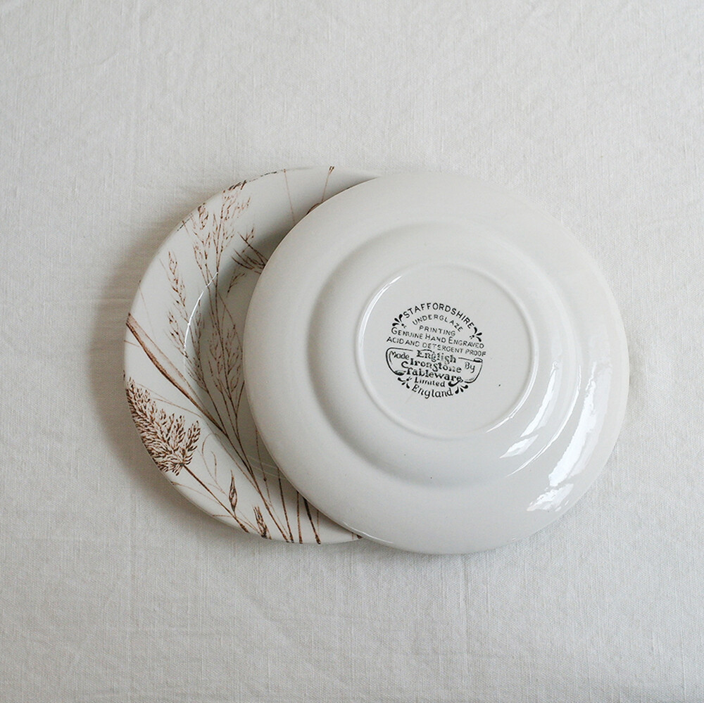 영국 스태포드셔 아이언스톤 테이블웨어의 갈색의 야생 귀리 그림이 있는 빈티지 접시들입니다.