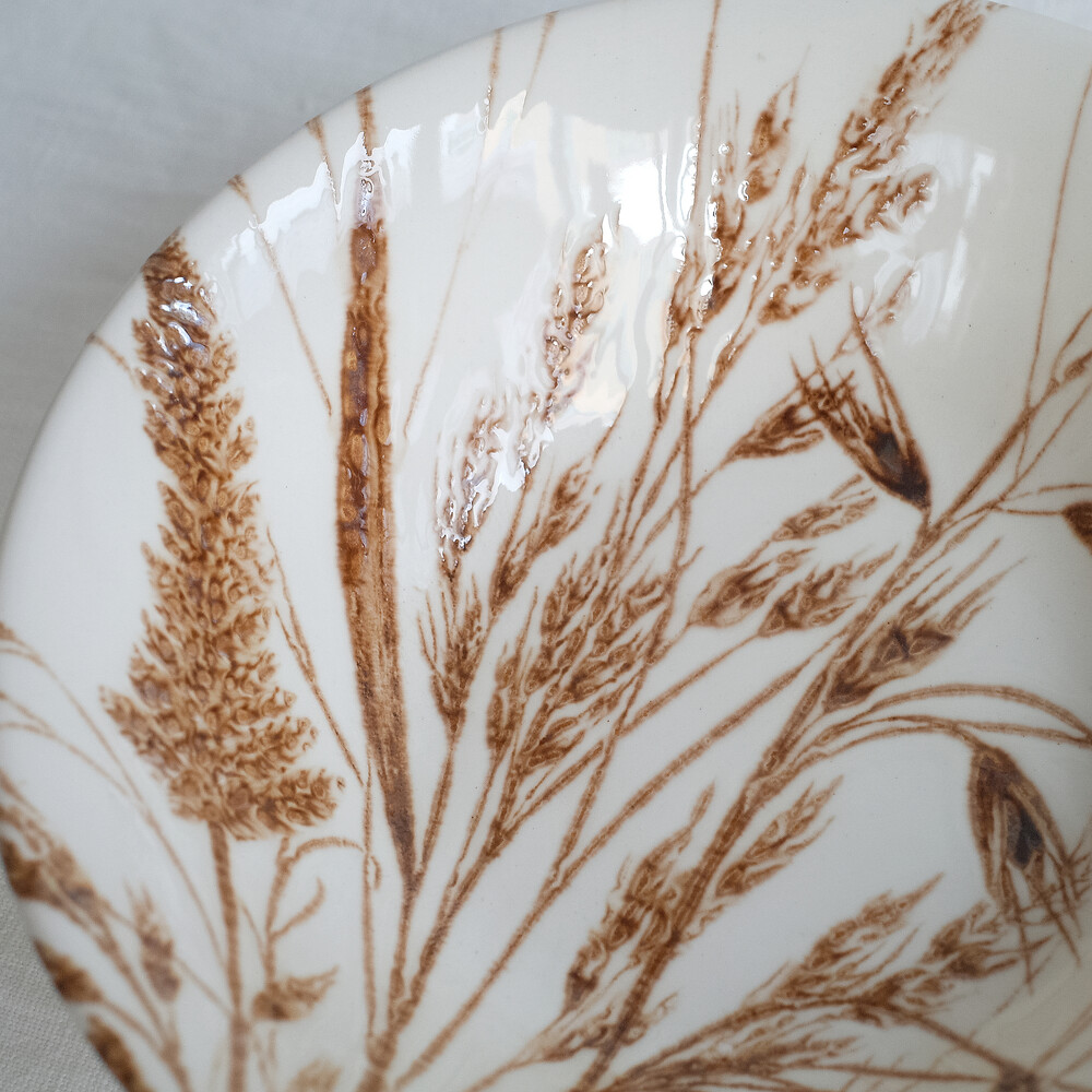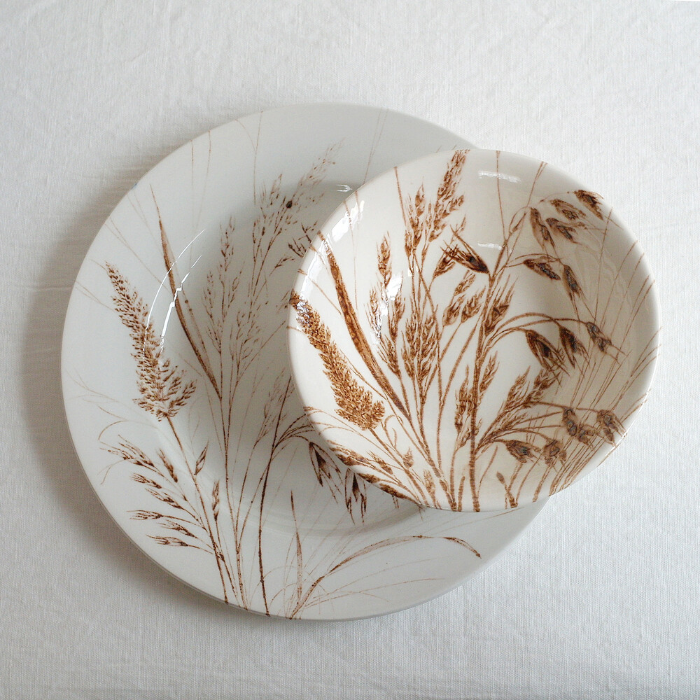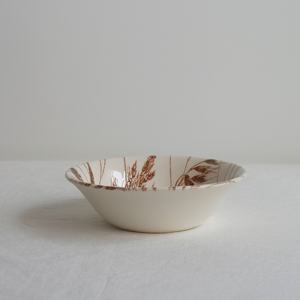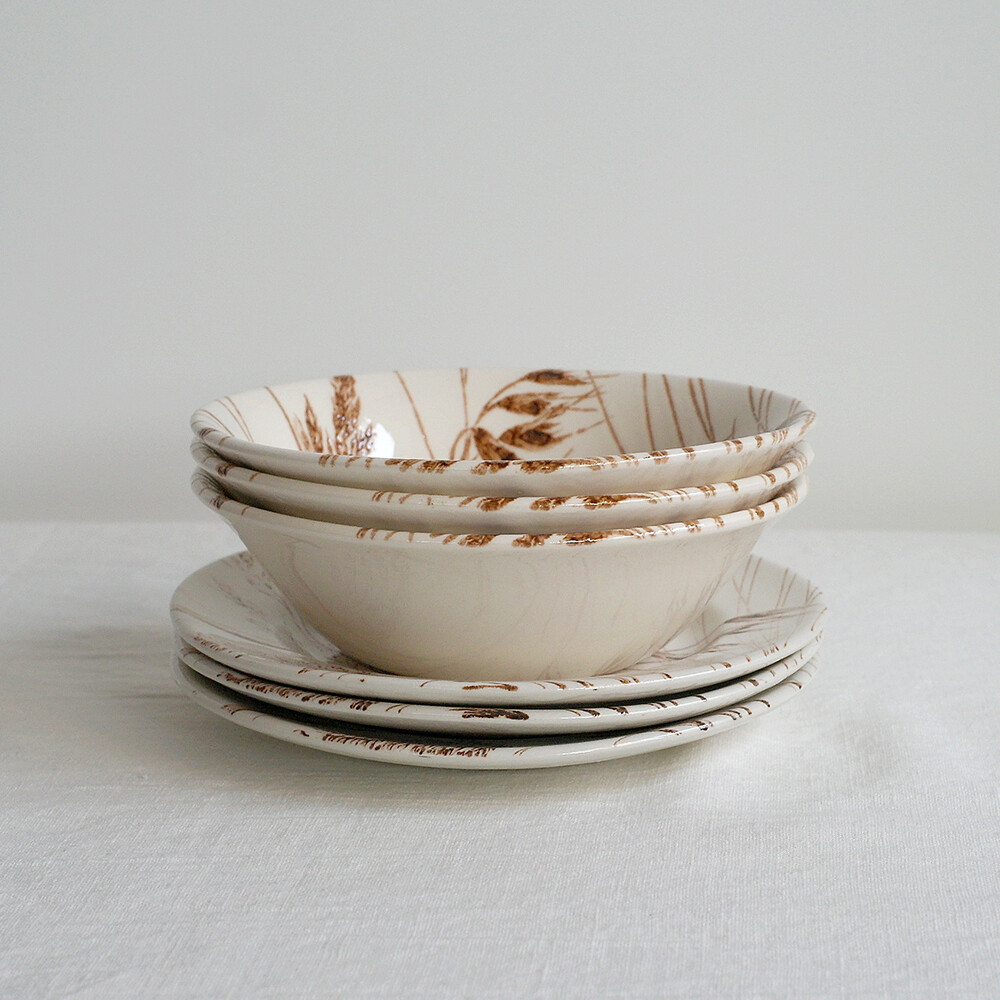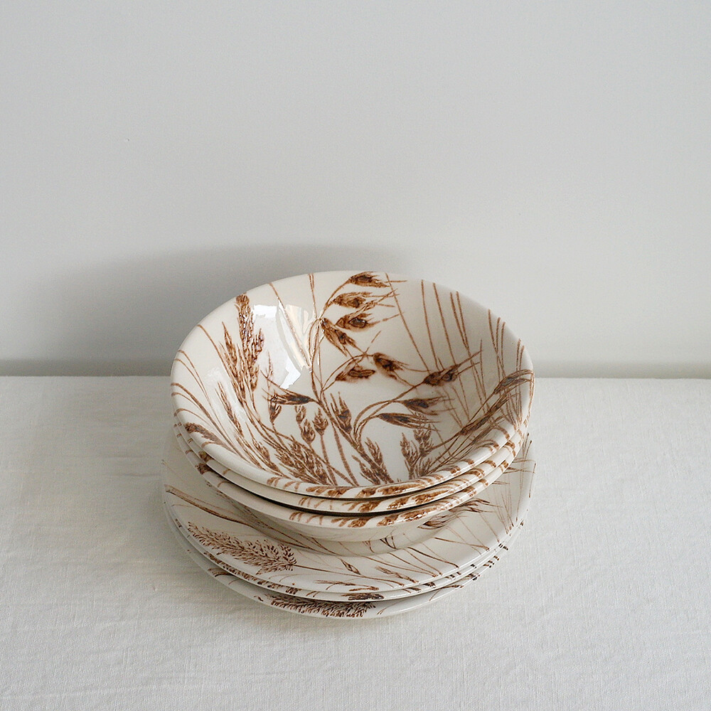 영국 스태포드셔 아이언스톤 테이블웨어의 갈색의 야생 귀리 그림이 있는 빈티지 접시들입니다.