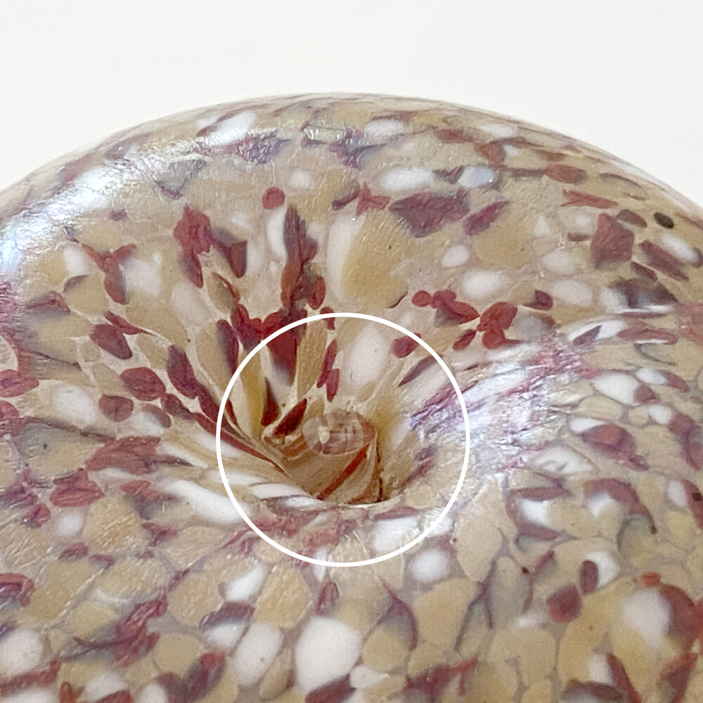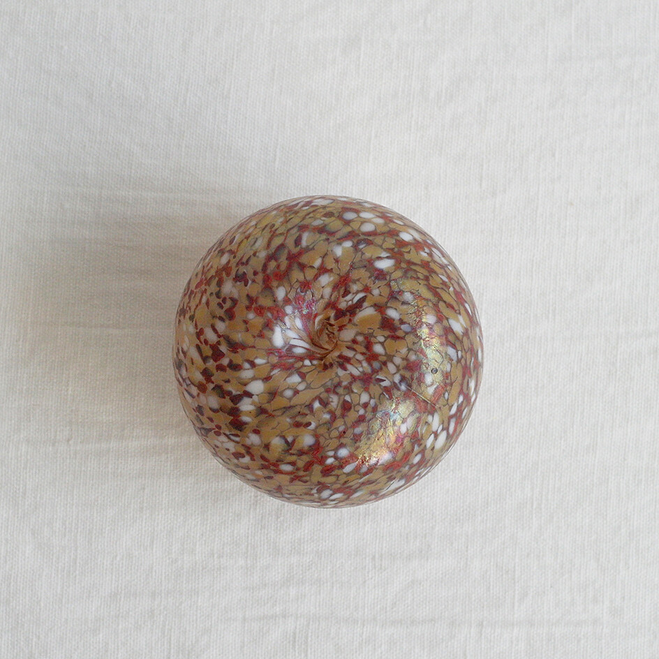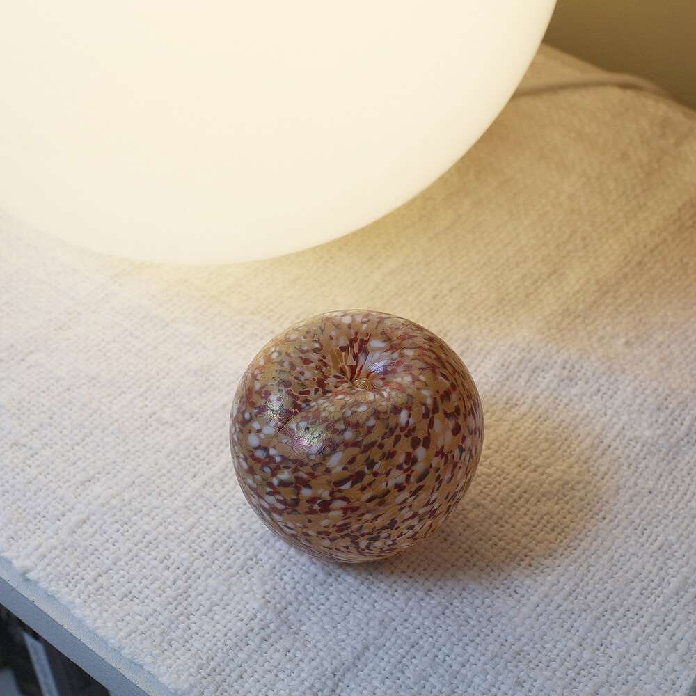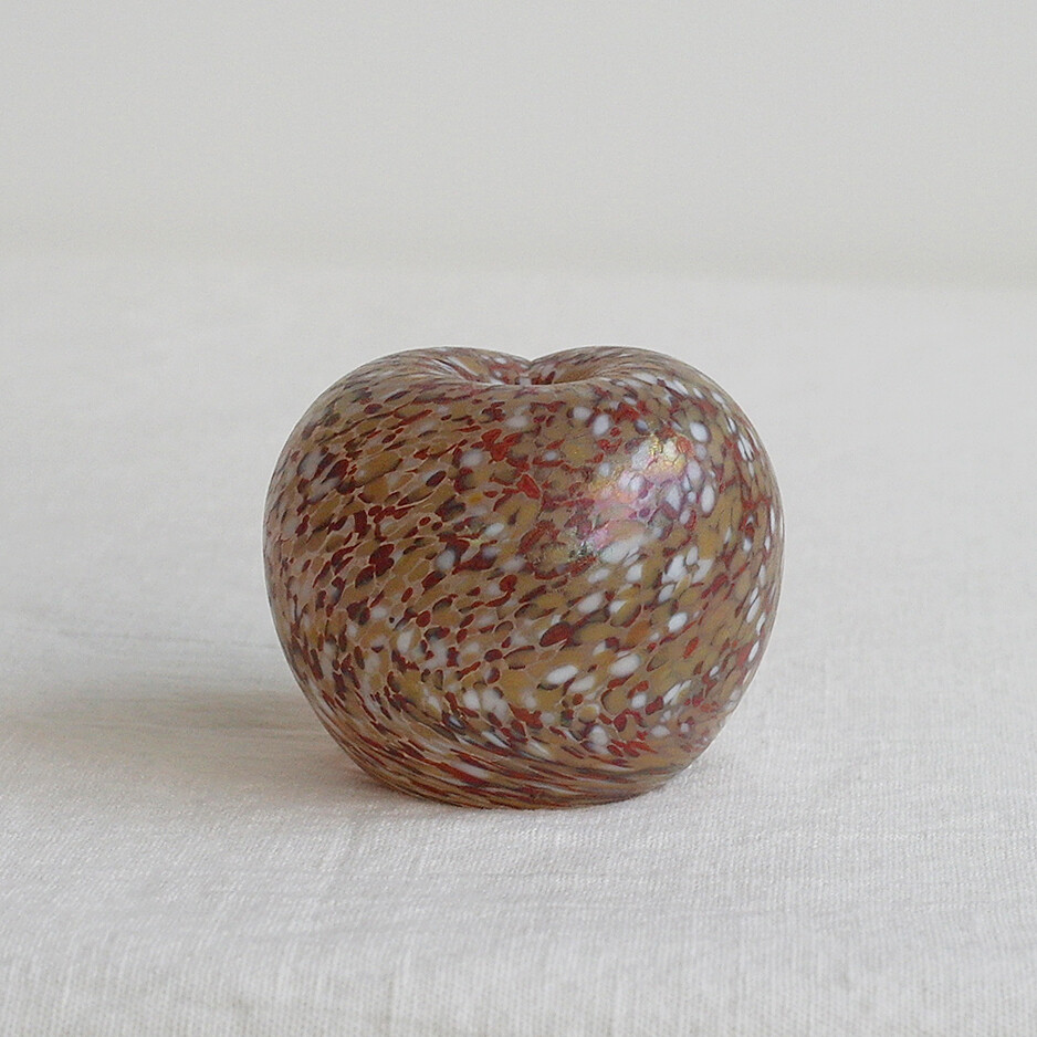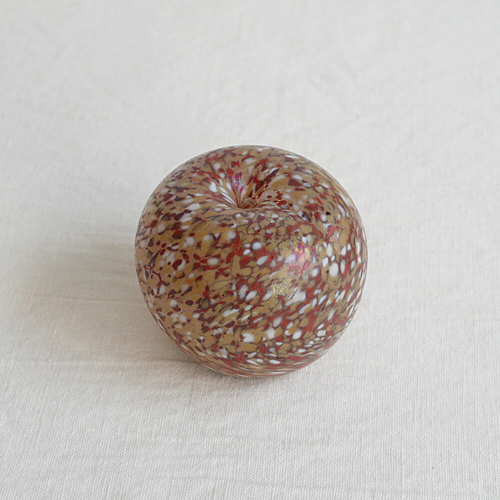 금색, 붉은색, 하얀색의 도트들이 사과 형태의 유리 문진 겉부분에 점묘화처럼 페인팅되어 있으며
