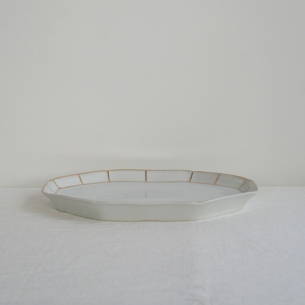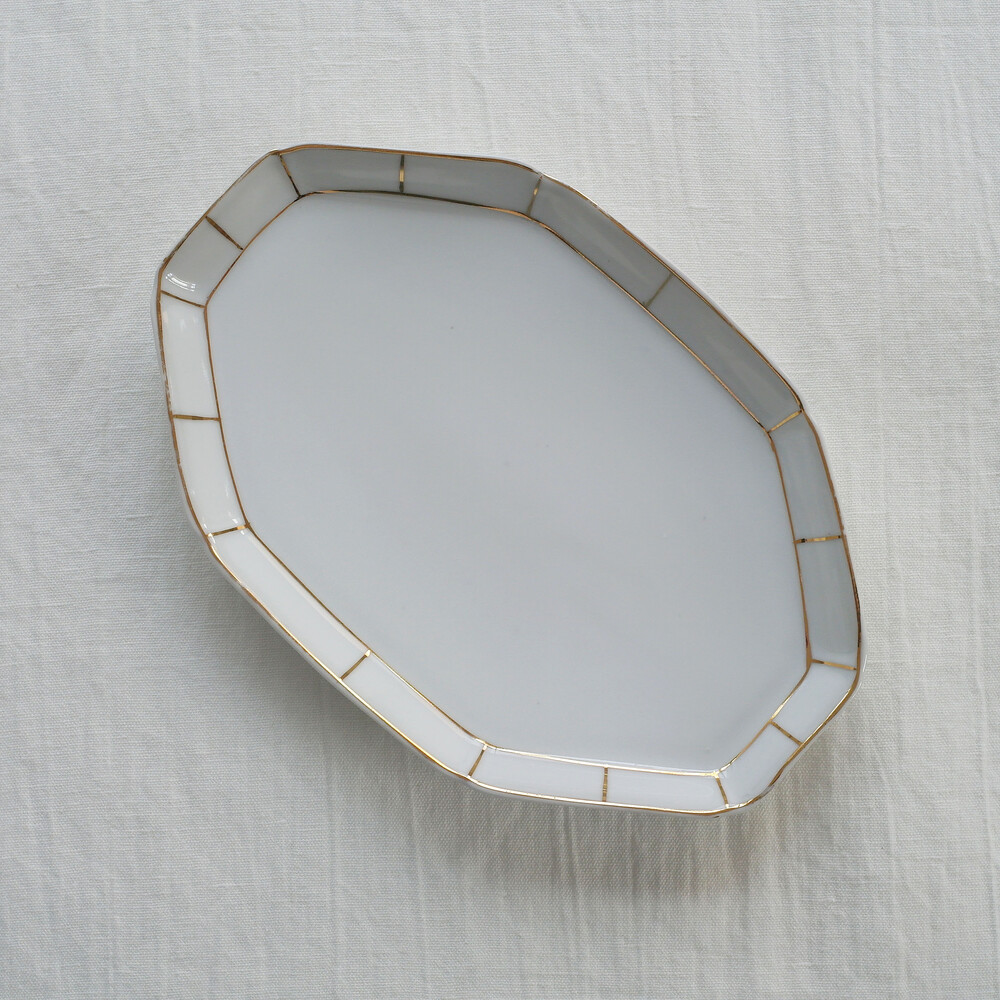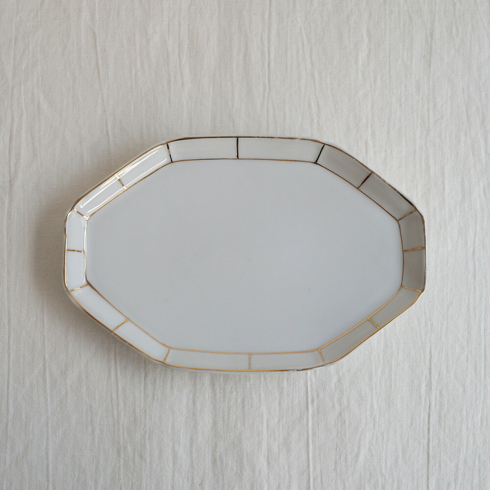 오벌 형태의 팔각 접시로, 각진 부분 마다 금박 라인으로 장식하여 멋을 더했습니다.