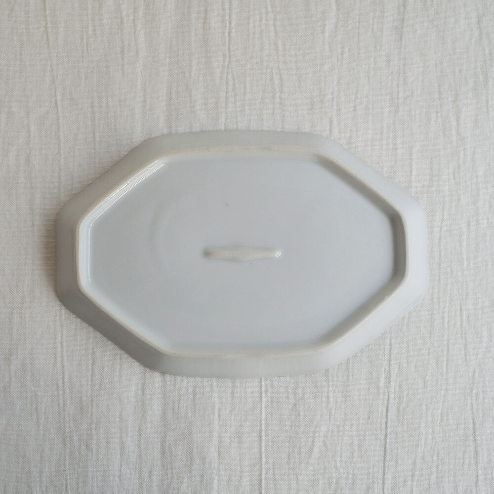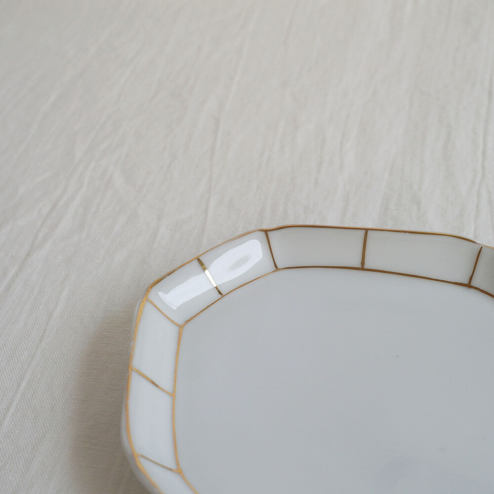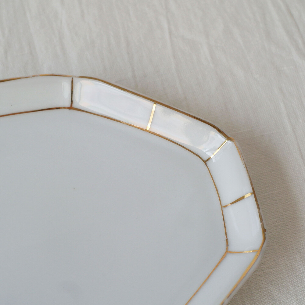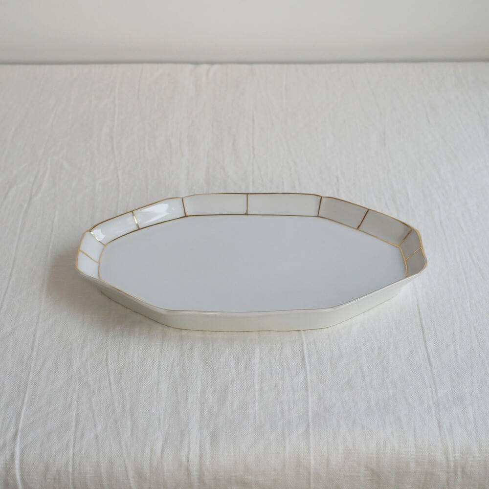 오벌 형태의 팔각 접시로, 각진 부분 마다 금박 라인으로 장식하여 멋을 더했습니다.