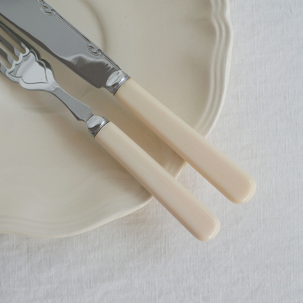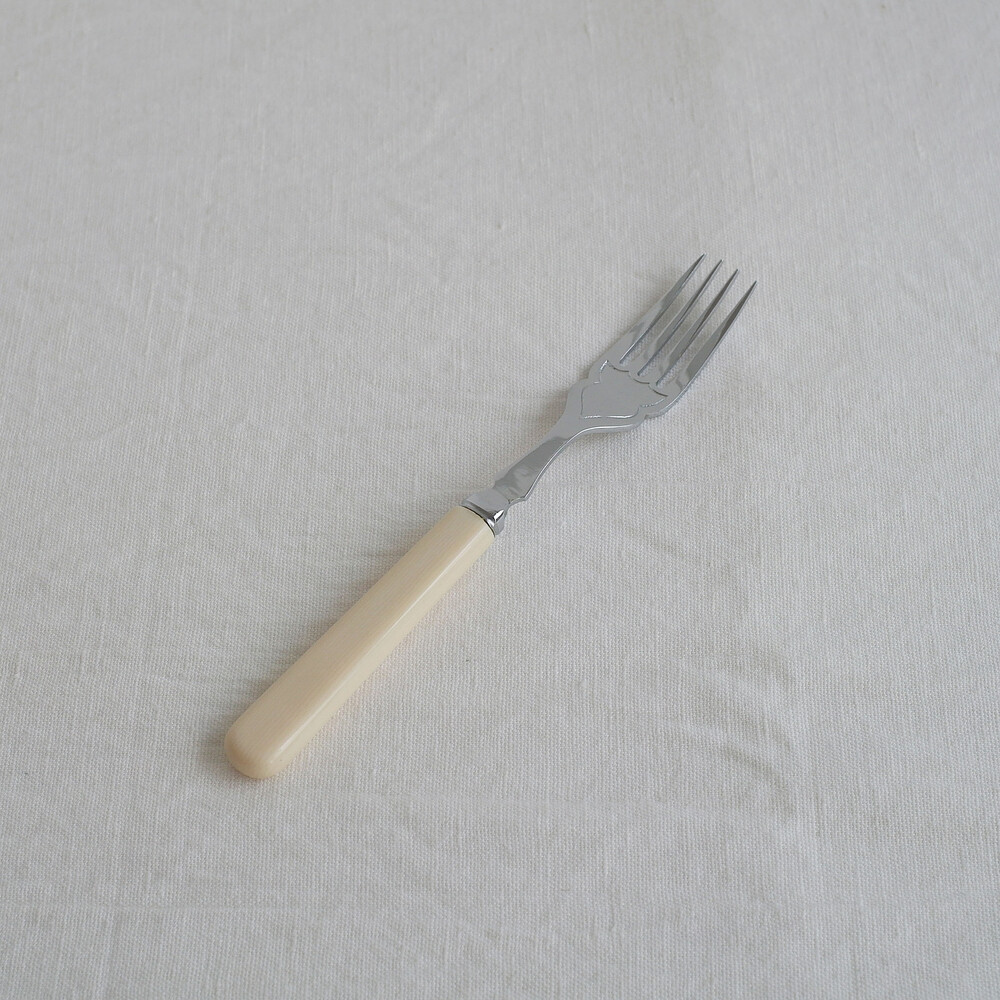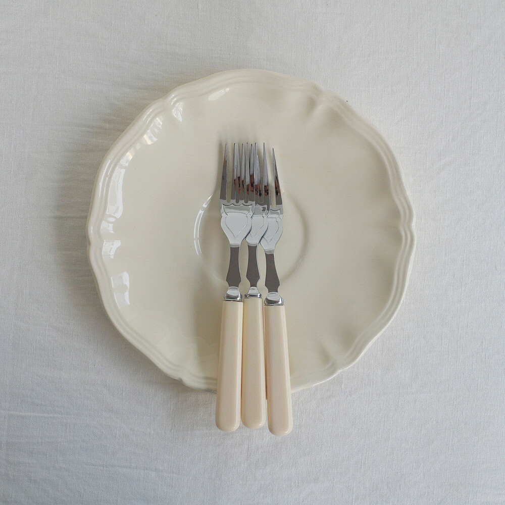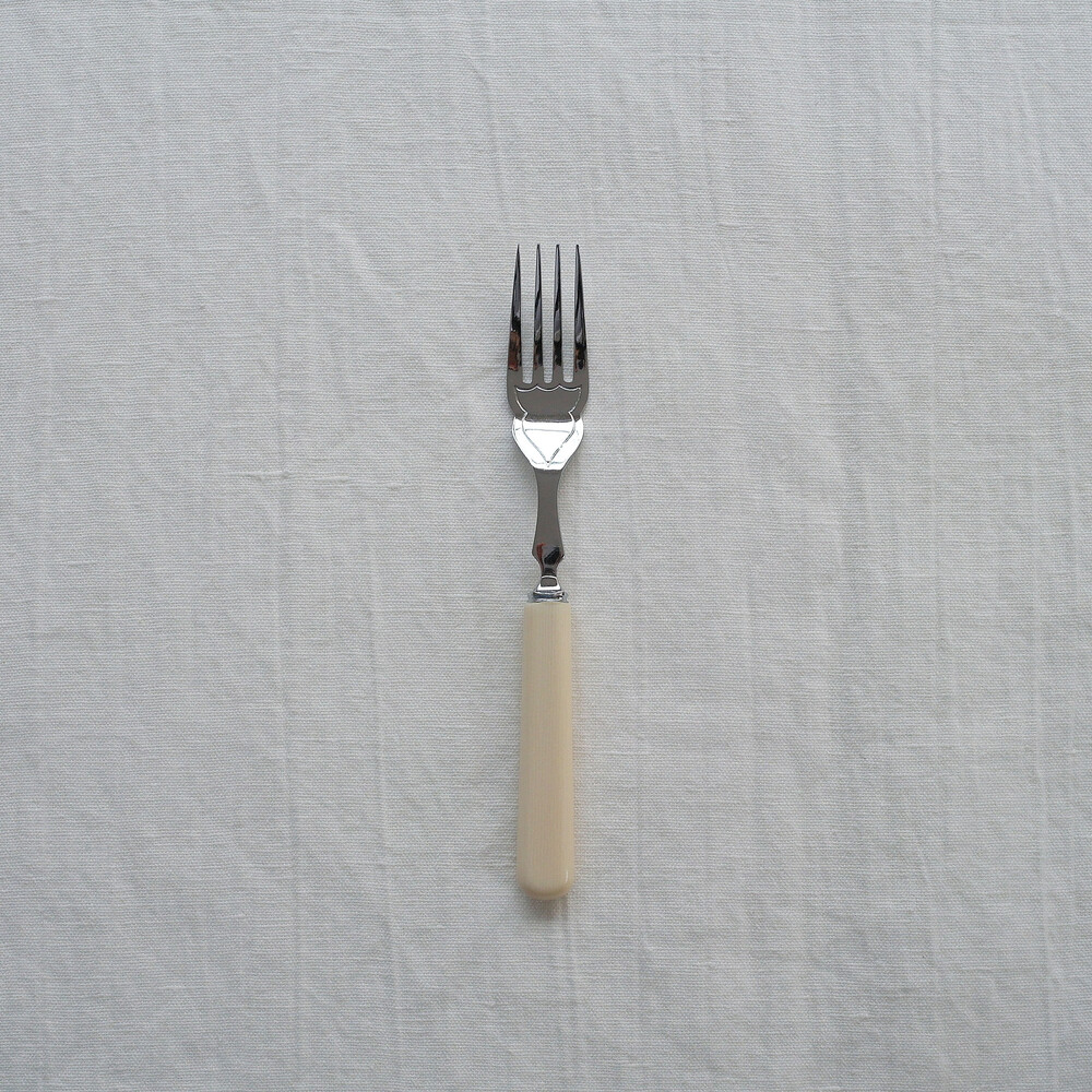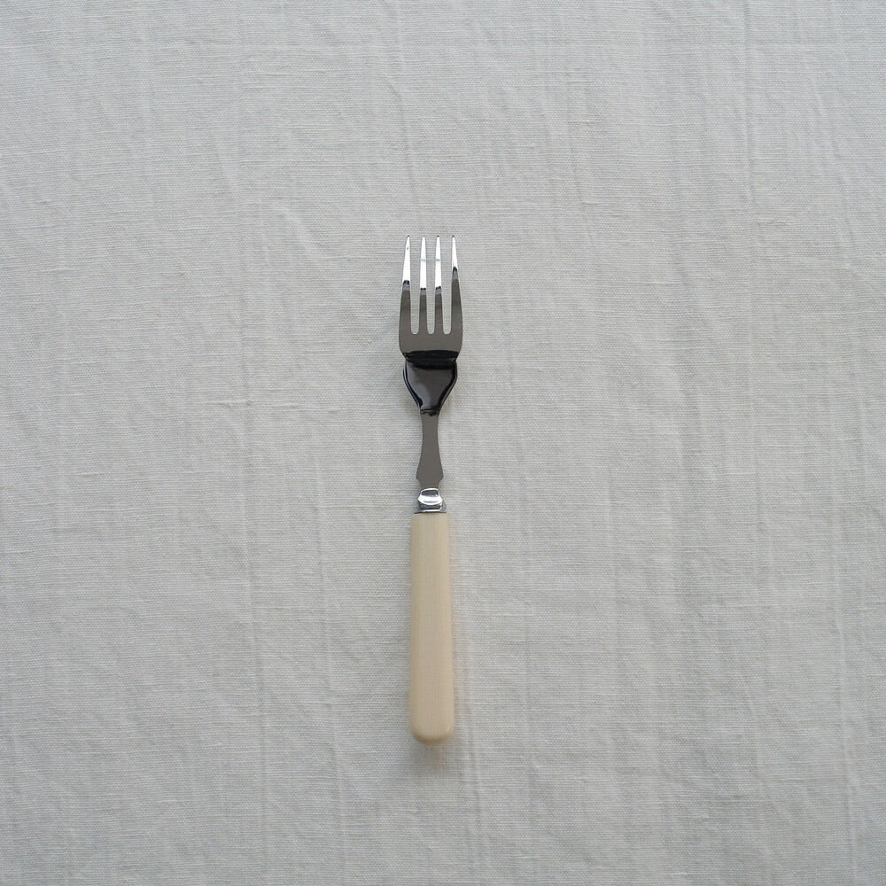 은은한 라인 패턴이 섞인 상아색 손잡이가 빈티지한 무드를 높여주는 포크 입니다