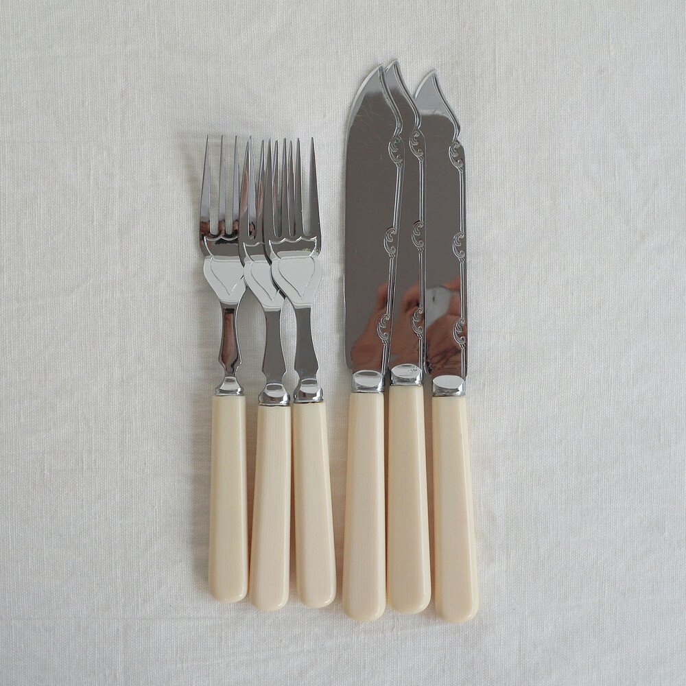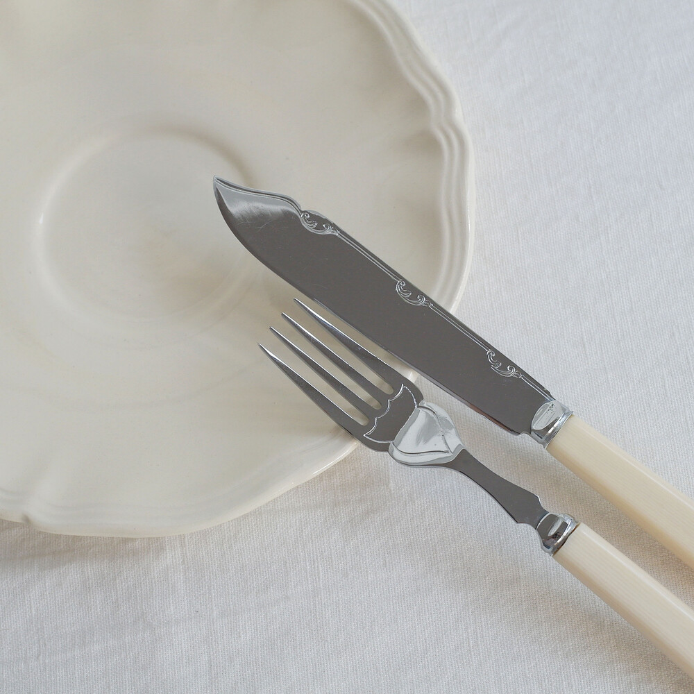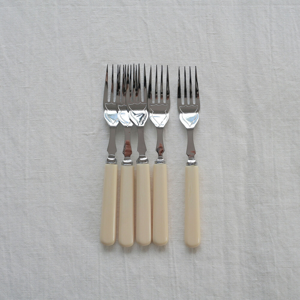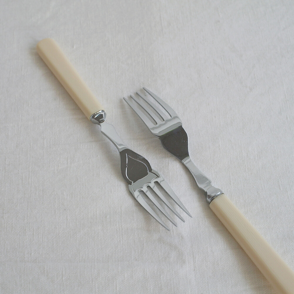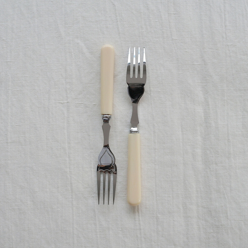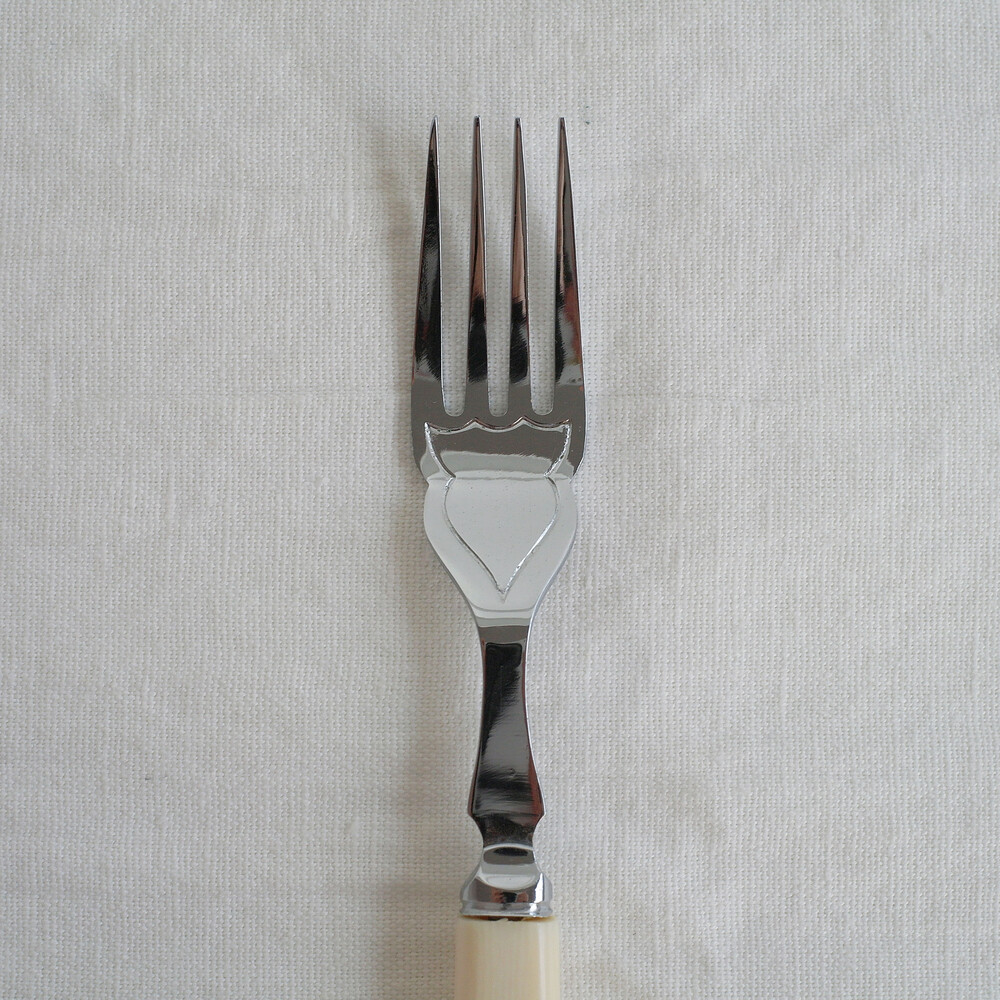 은은한 라인 패턴이 섞인 상아색 손잡이가 빈티지한 무드를 높여주는 포크 입니다