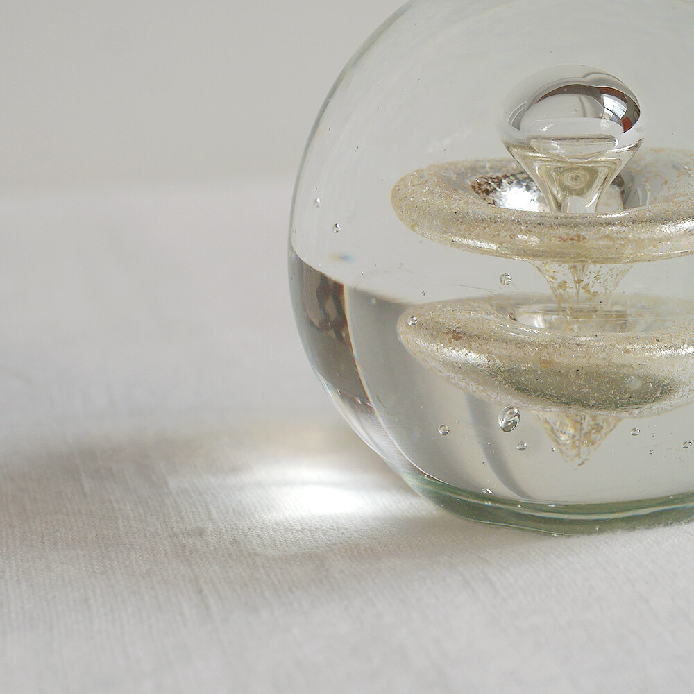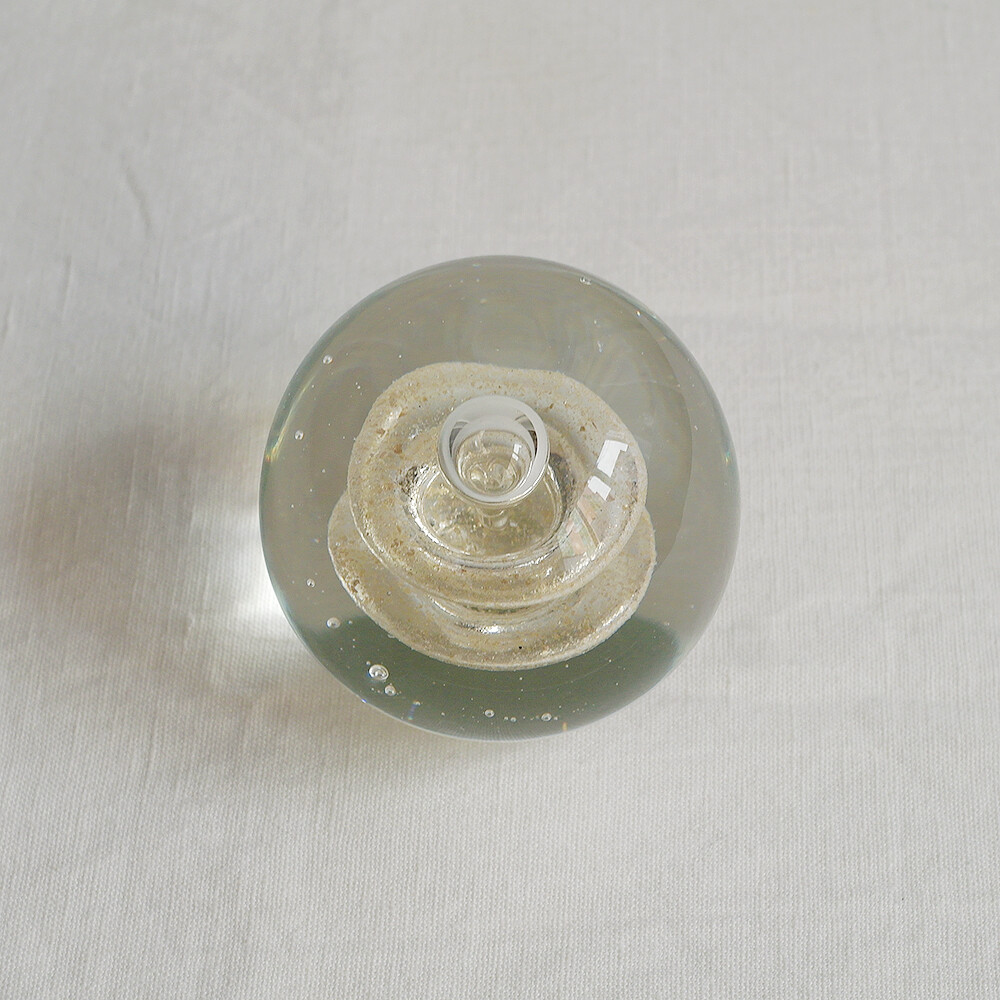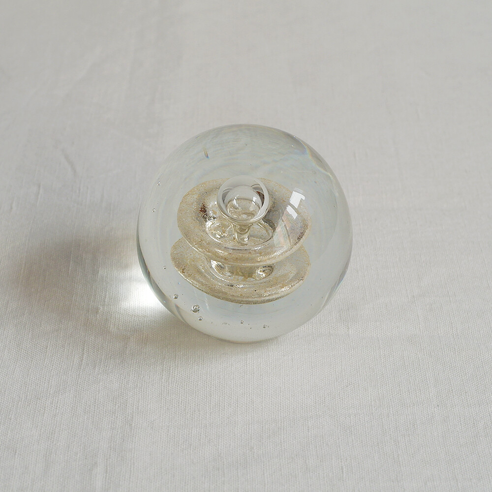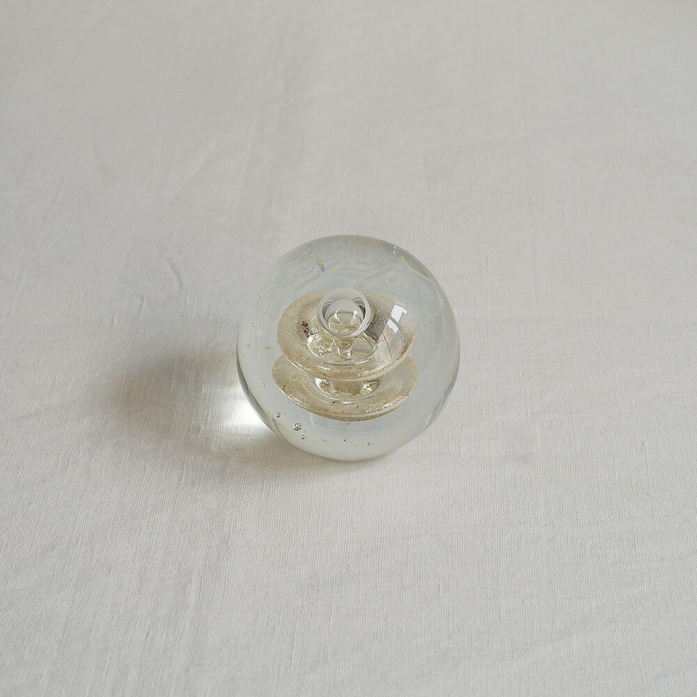 구형의 중앙에 금빛 회로이가 있는 아담한 사이즈의 빈티지 유리 문진 입니다.