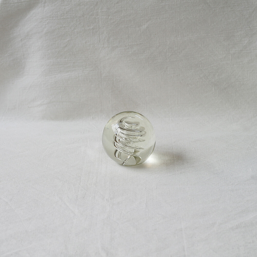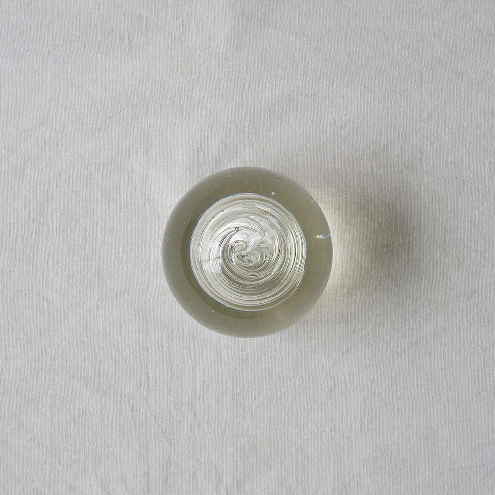 구형의 중앙에 커다란 기포가 회오리처럼 만들어진 비교적 큰 사이즈의 빈티지 유리문진 입니다.