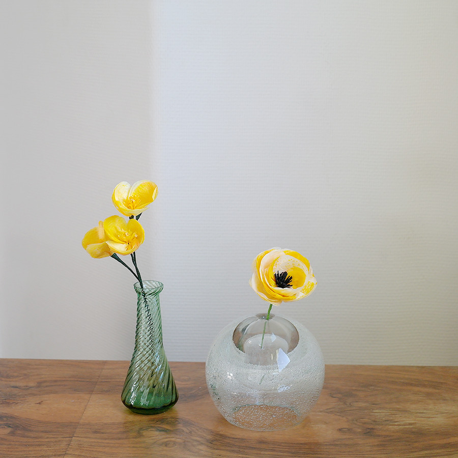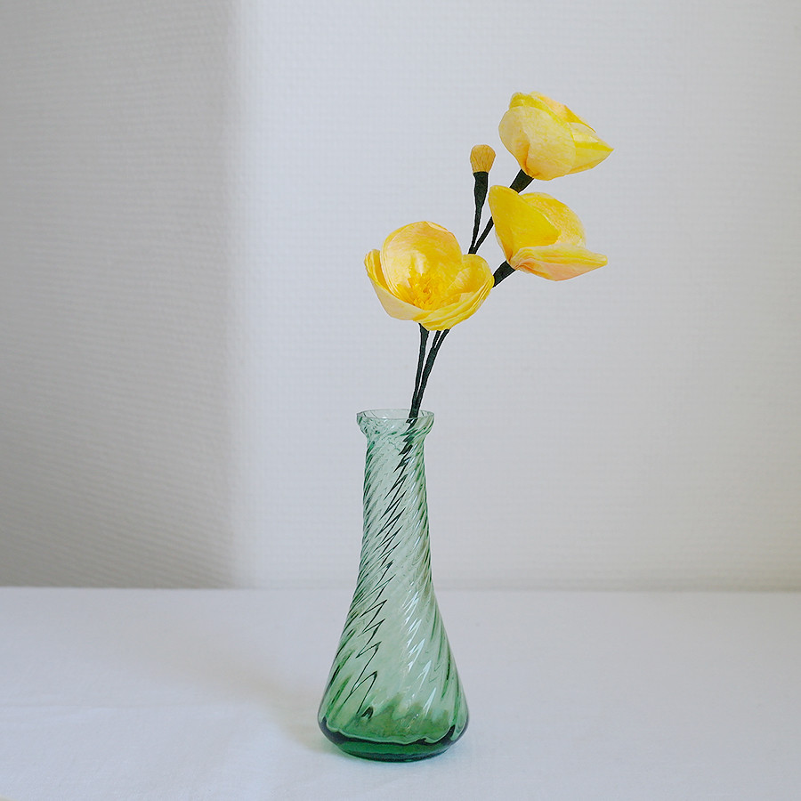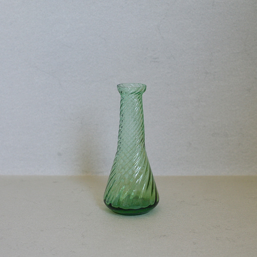 비커 모양으로 만들어진 형태와, 물결치듯 올라가는 무늬의 초록색 화병이에요.