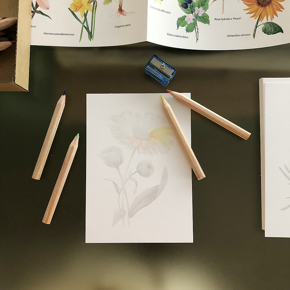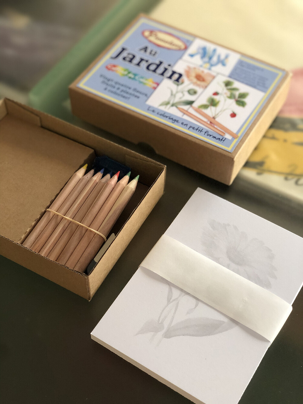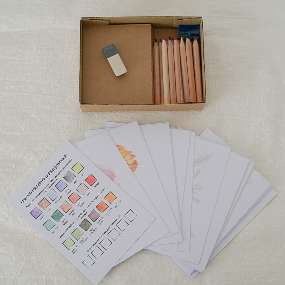 * 구성품 : 색칠 그림 엽서 24장, 색연필 12개, 흑연연필, 지우개, 연필깍이. 가이드 그림.