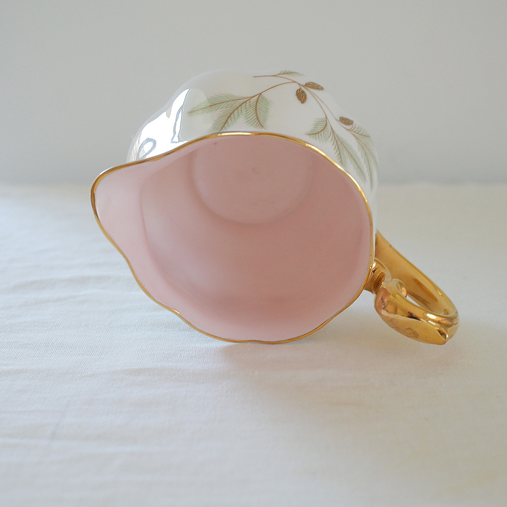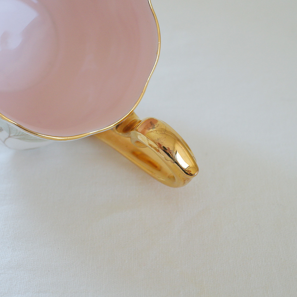 꽃잎 모양의 금색 테두리와, 화이트 본차이나- 밝고 따뜻한 핑크색의 조화와 함께.