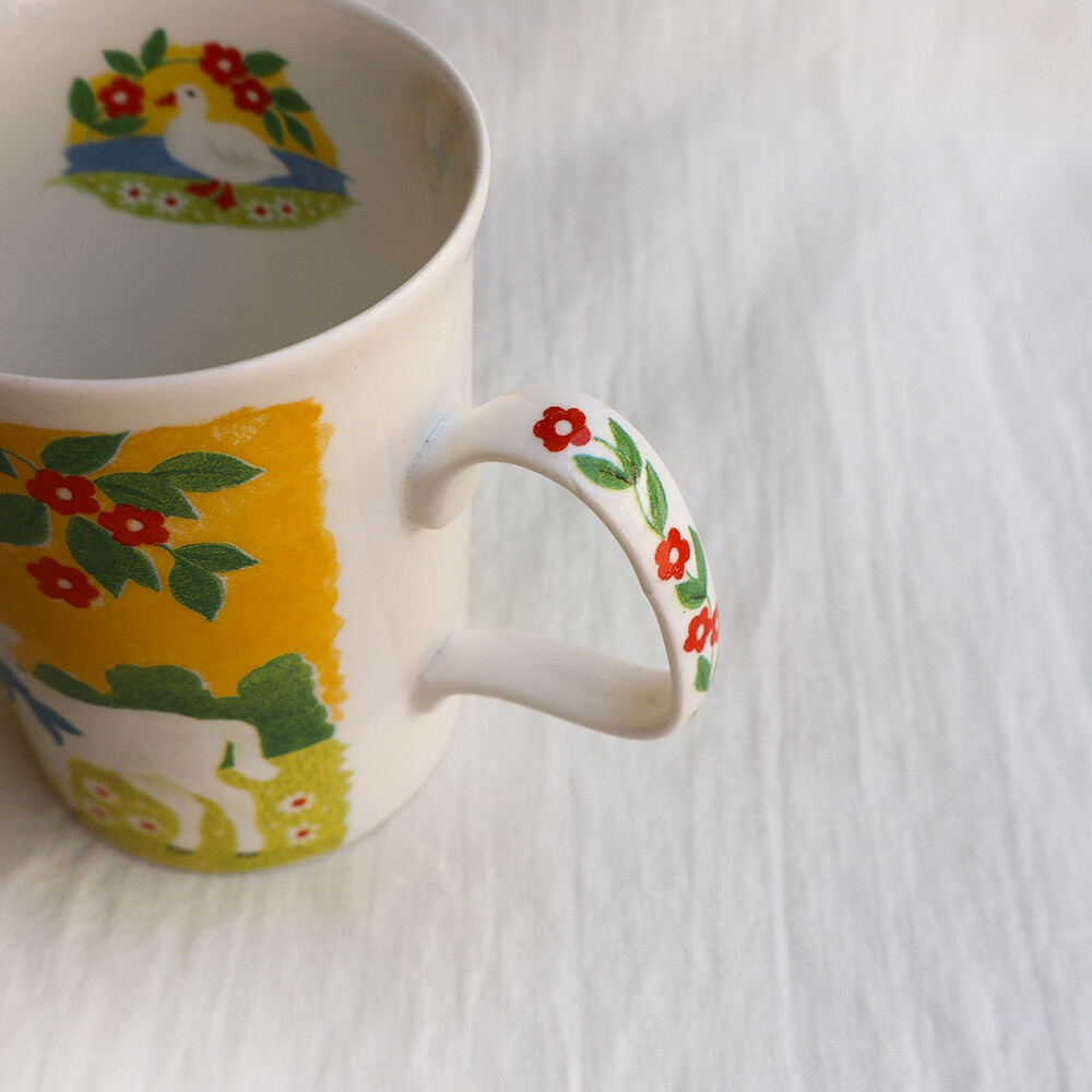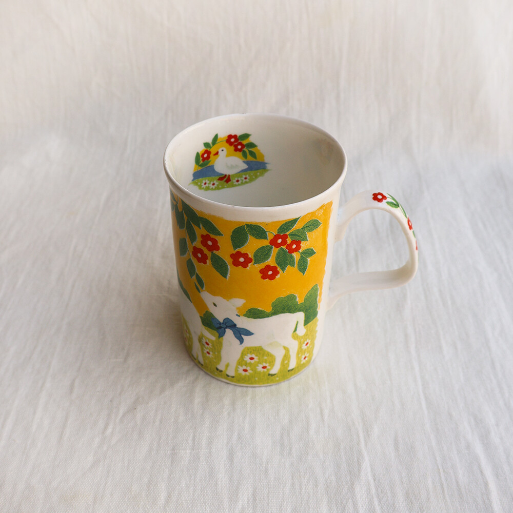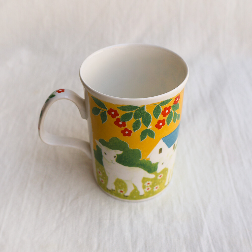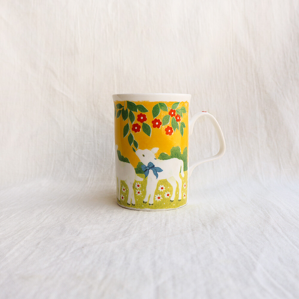 경쾌한 컬러감과, 푸른 리본을 두른 양의 모습이 평화로운 느낌을 주는 일러스트가 그려진 머그컵입니다.