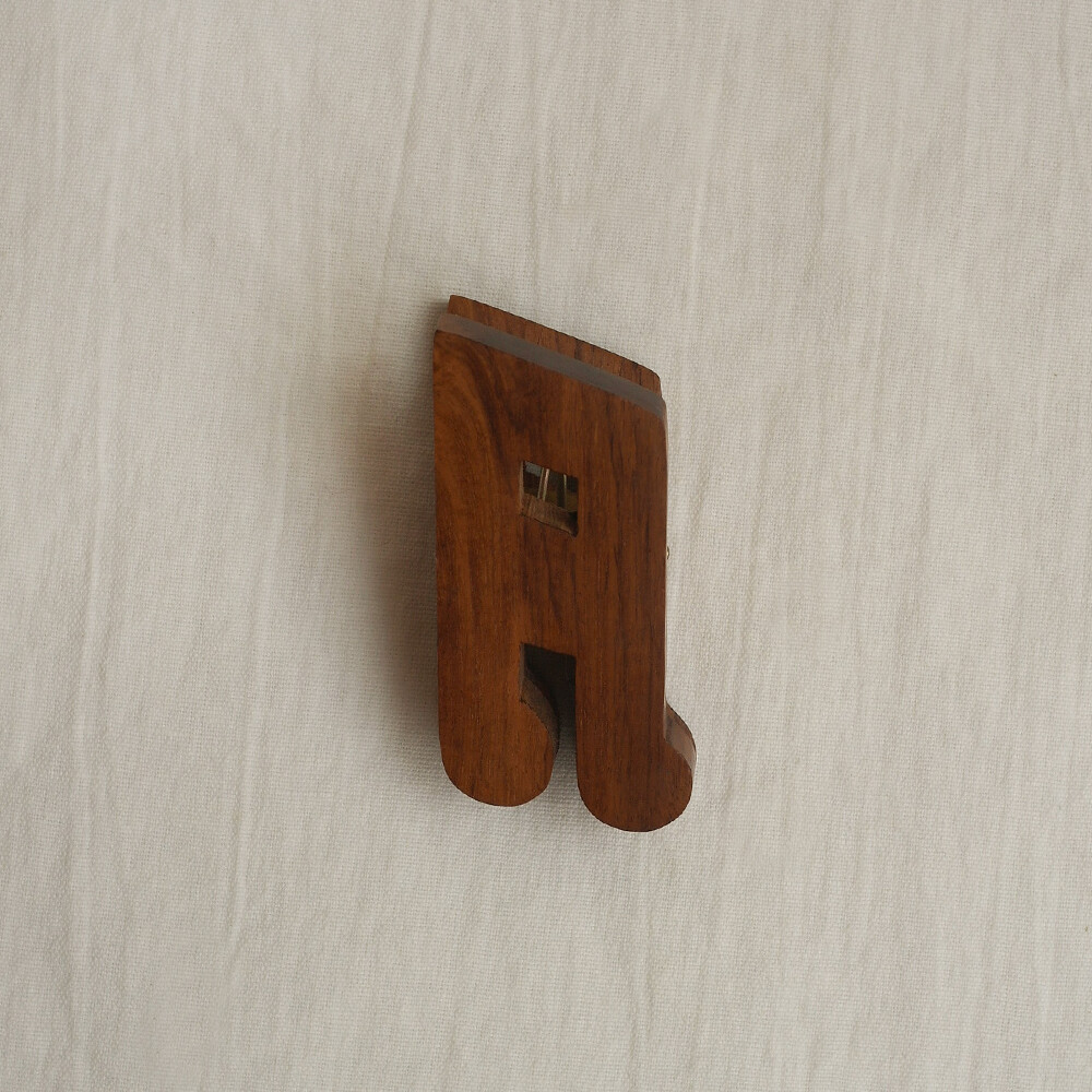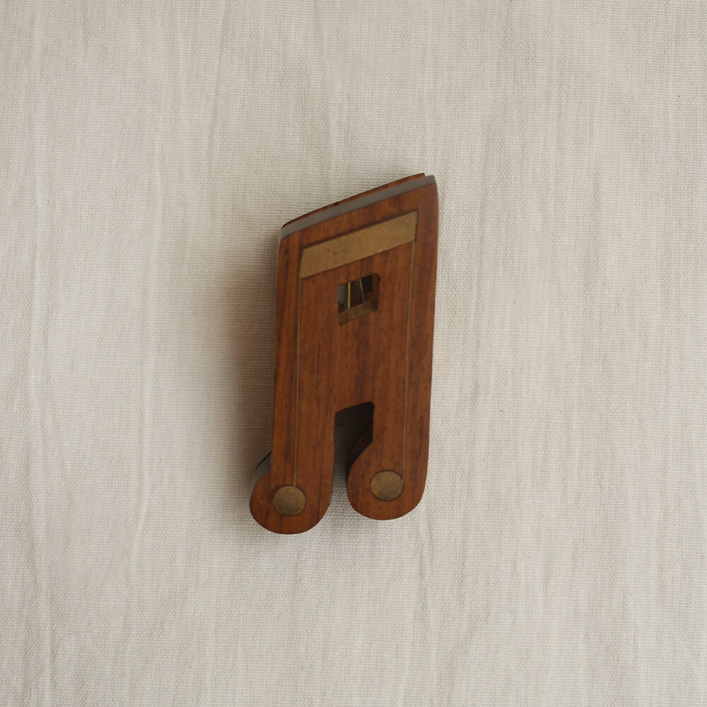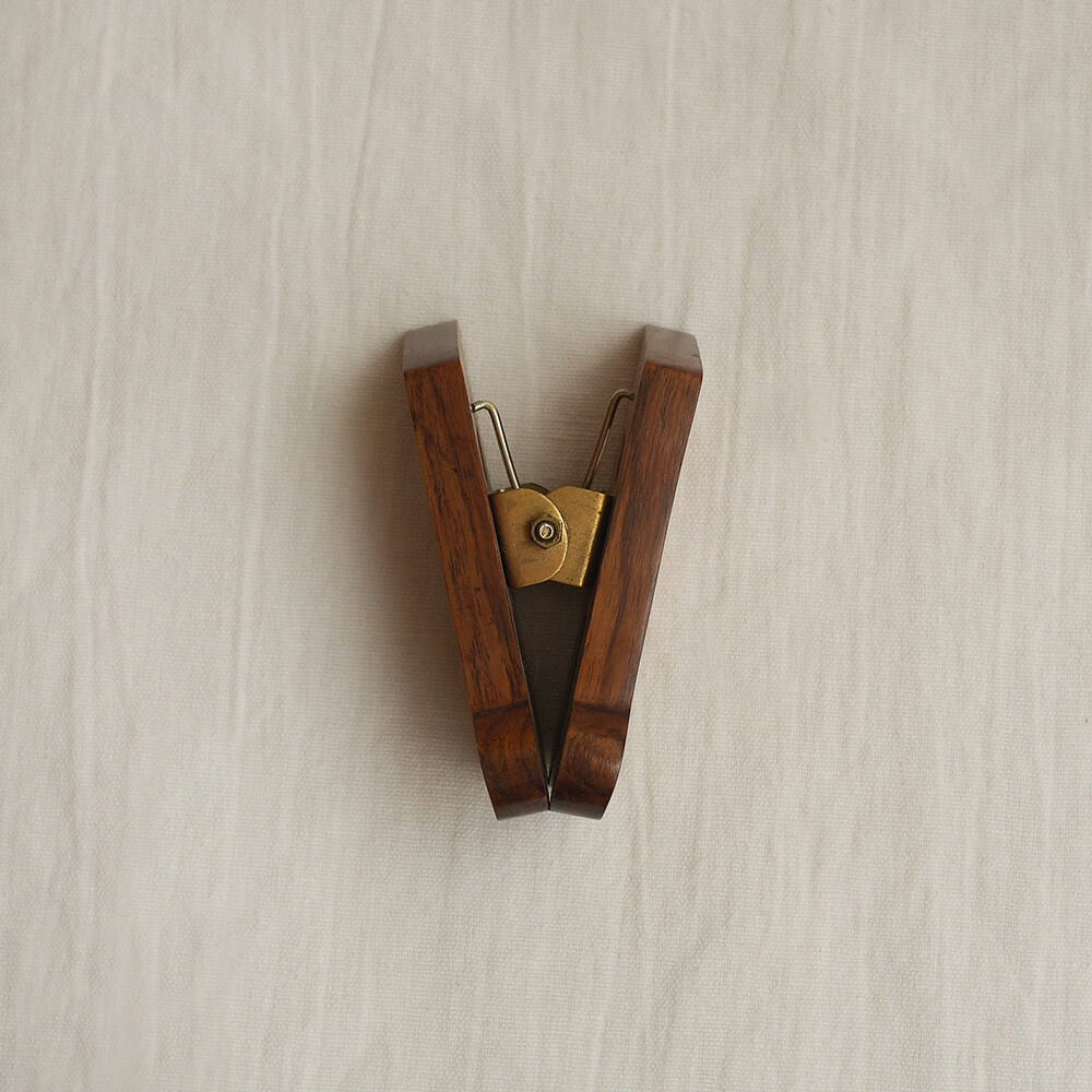 나무와 황동으로 만들어진 음표모양의 페이퍼 클립입니다.