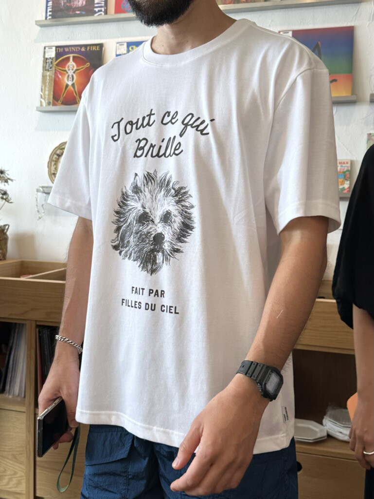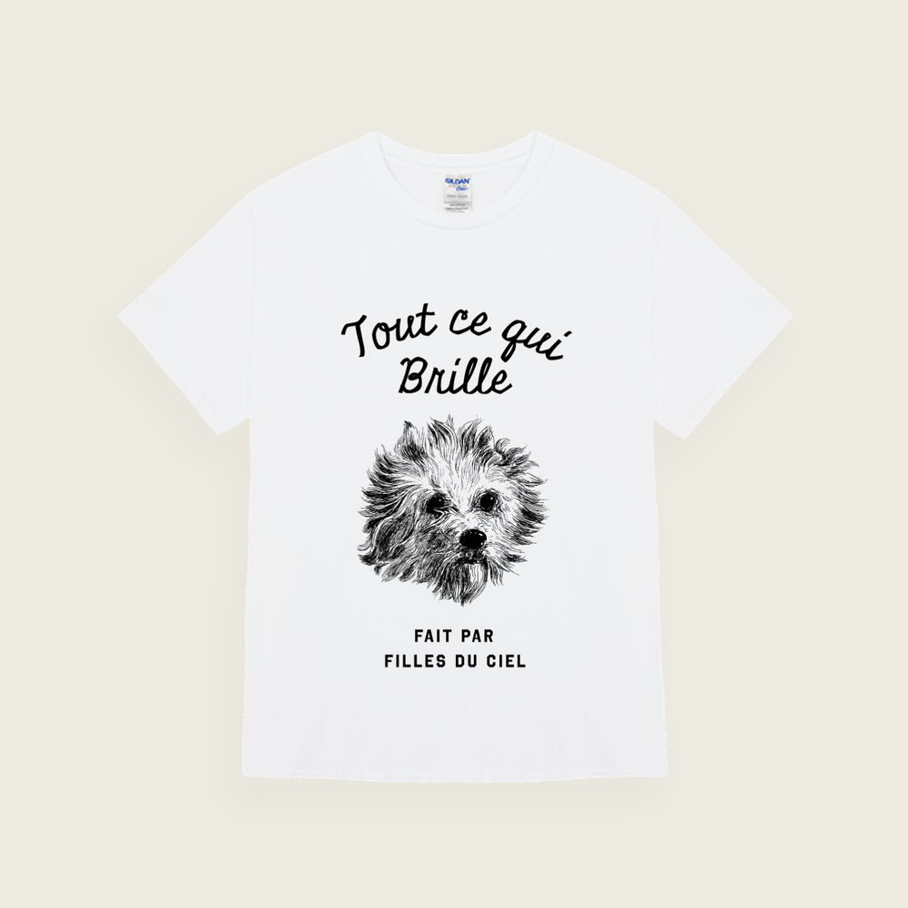 투스키브릴 이벤트를 기념해 제작한 강아지 그림이 있는 '반짝이는 모든 것' 티셔츠 입니다.