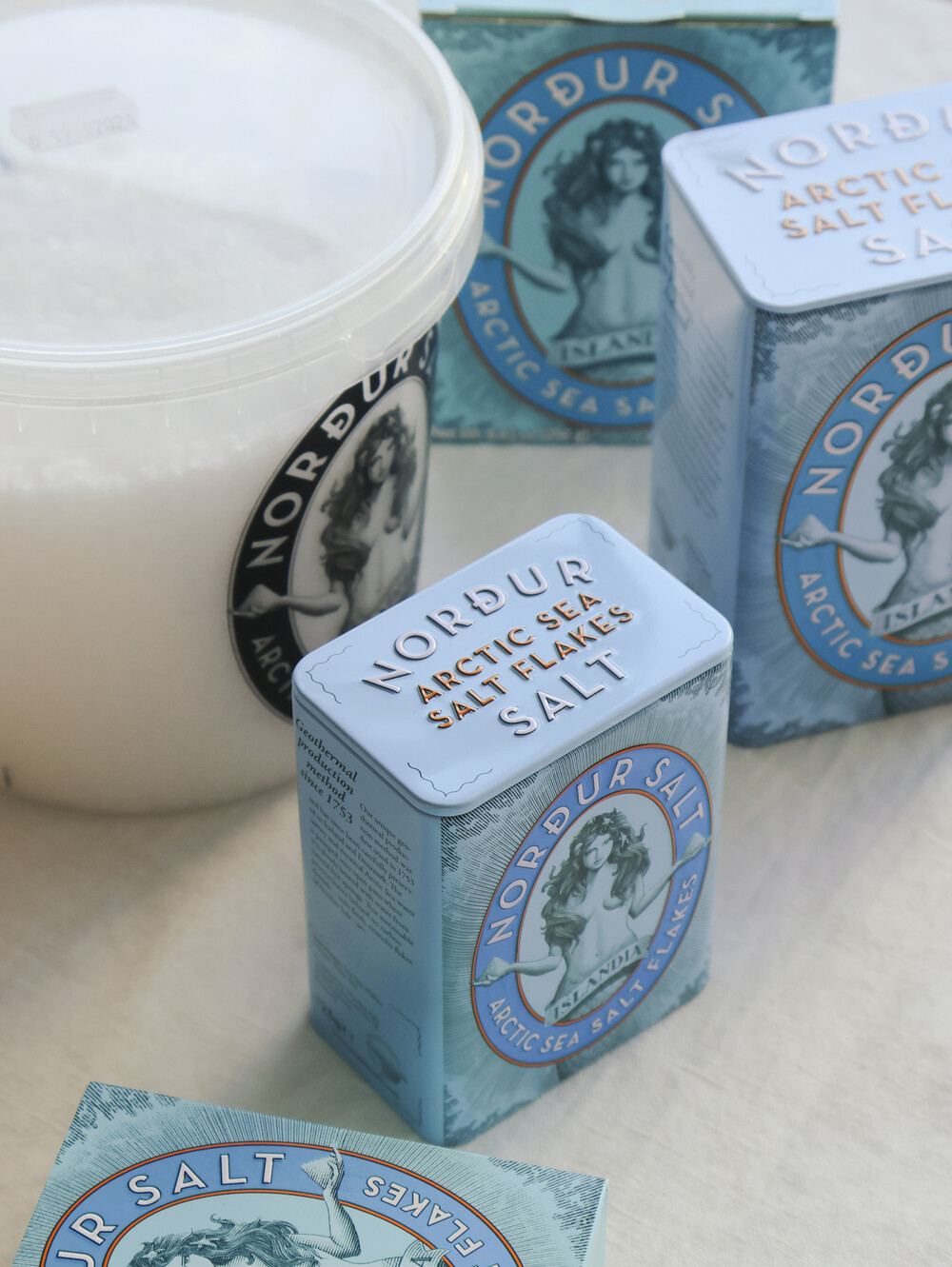 노르뒤 씨 솔트의 특별한 패키지는 레이캬비크 Jónsson & Le'mack의 디자인 팀과 협력하여 제작되었으며 ‘Red Dot Design Award 2014’의 패키징 부문과 다양한 아이슬란드 어워드를 수상했으며 Cannes Lions 및 Epica의 파이널리스트로 진출하기도 했습니다. 종이 패키지 제품의 박스는 재질 또한 재활용 종이로 생산하여 ‘지속가능성'이라는 노르뒤 사의 원칙을 담았습니다. 블루와 오렌지 컬러의 조합은 화산과 빙하가 공존하는 불과 얼음의 땅 아이슬란드를 표현하며, 노르뒤 사 고유의 일러스트 속 인어 ‘Alda 앨다'는 ’브레이다 피오르’로 흘러드는 북극해의 순수함을, 양 손에 들고 있는 소금 더미는 지속가능성에 대한 노르뒤 사의 균형 잡힌 시각을 상징합니다.