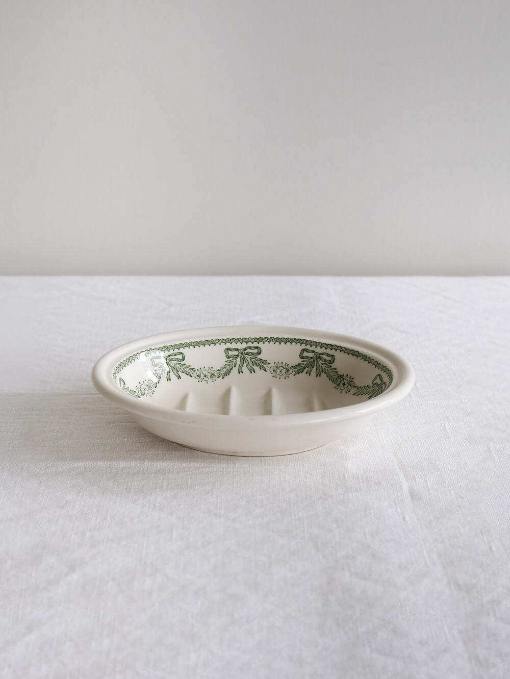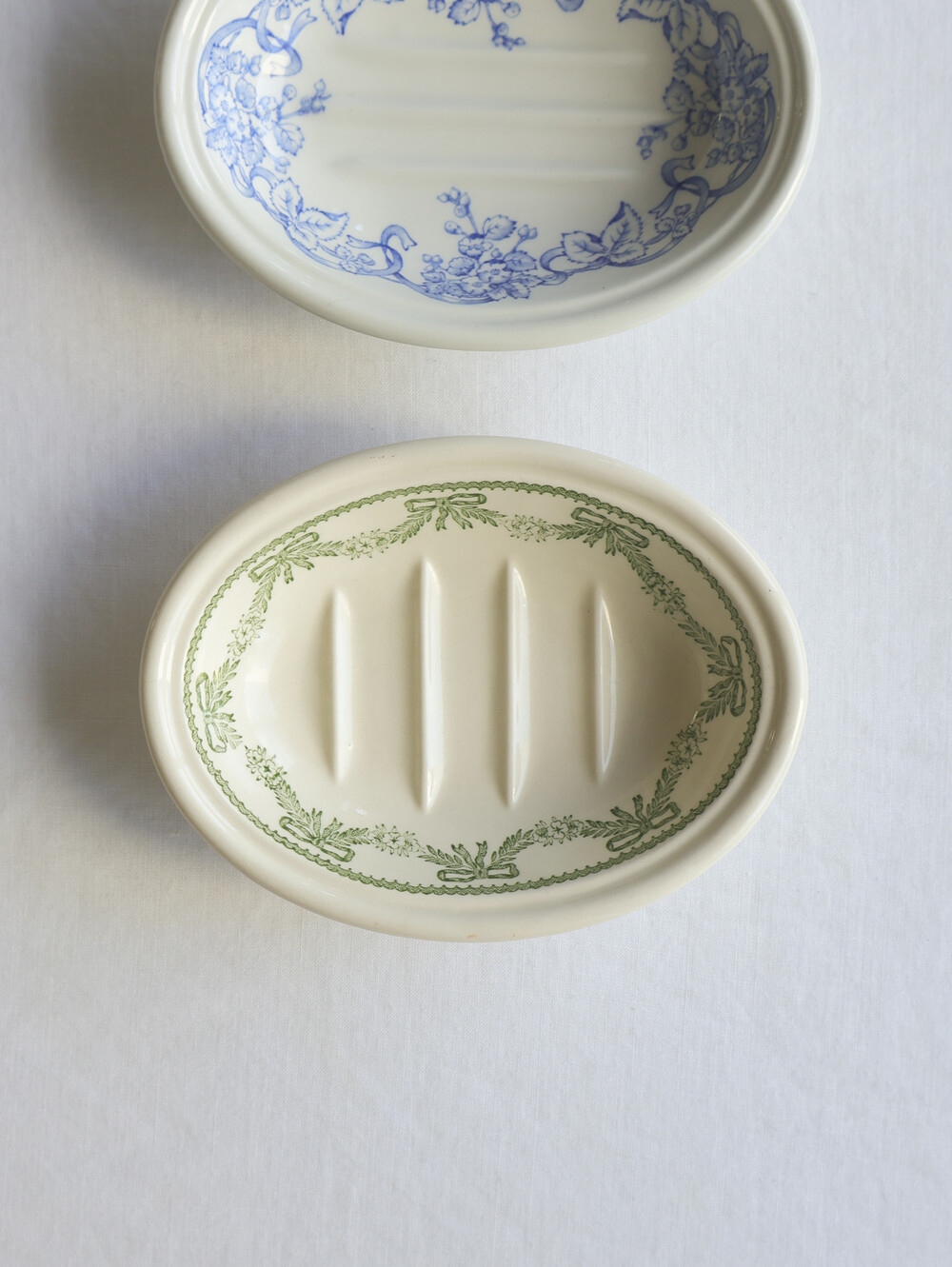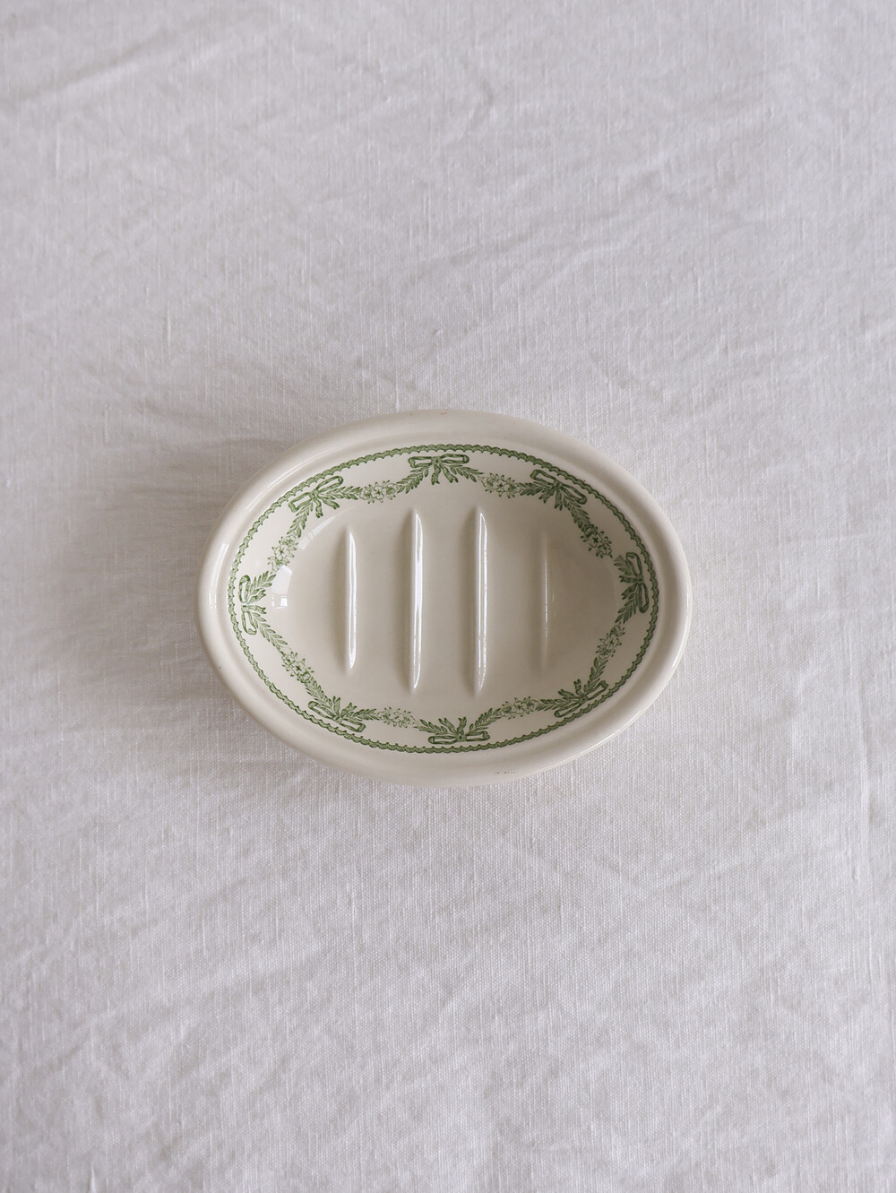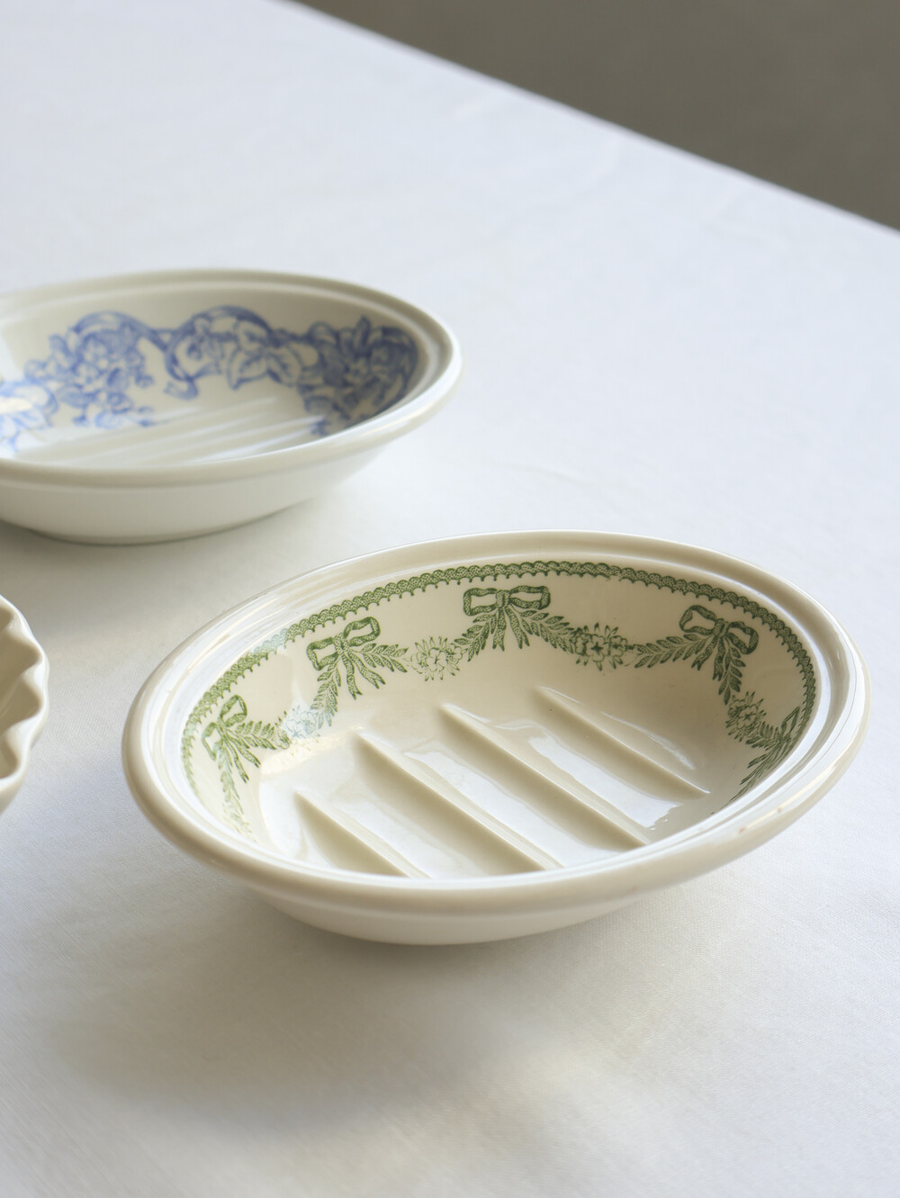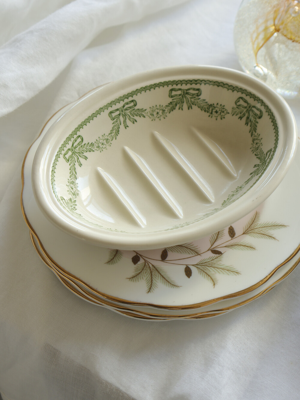 차분한 녹색의 리본 그림이 있는 비누 디쉬로서, 욕실 인테리어에포인트를 주기 좋습니다.