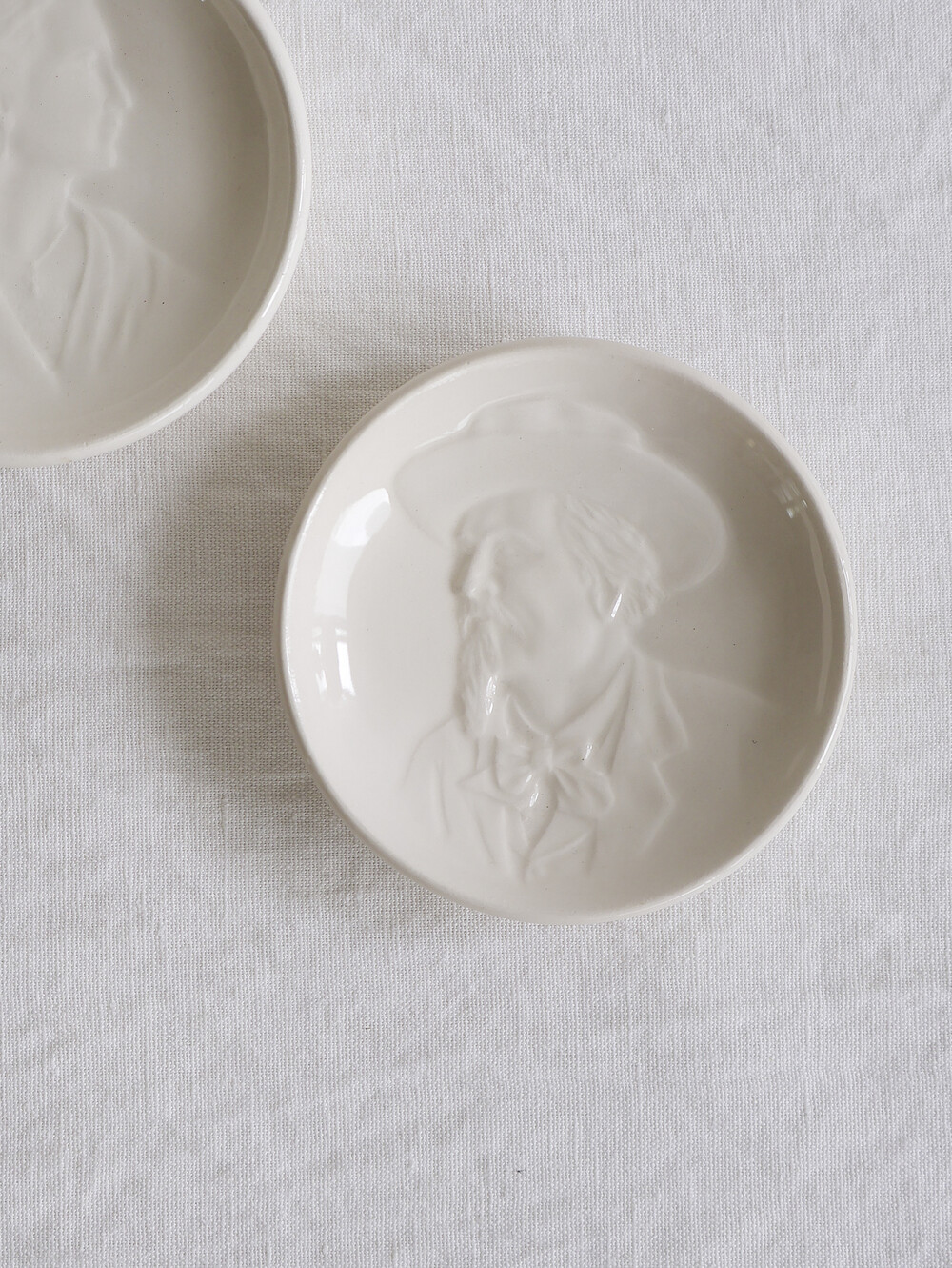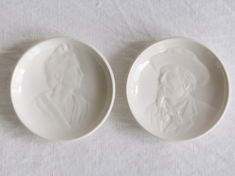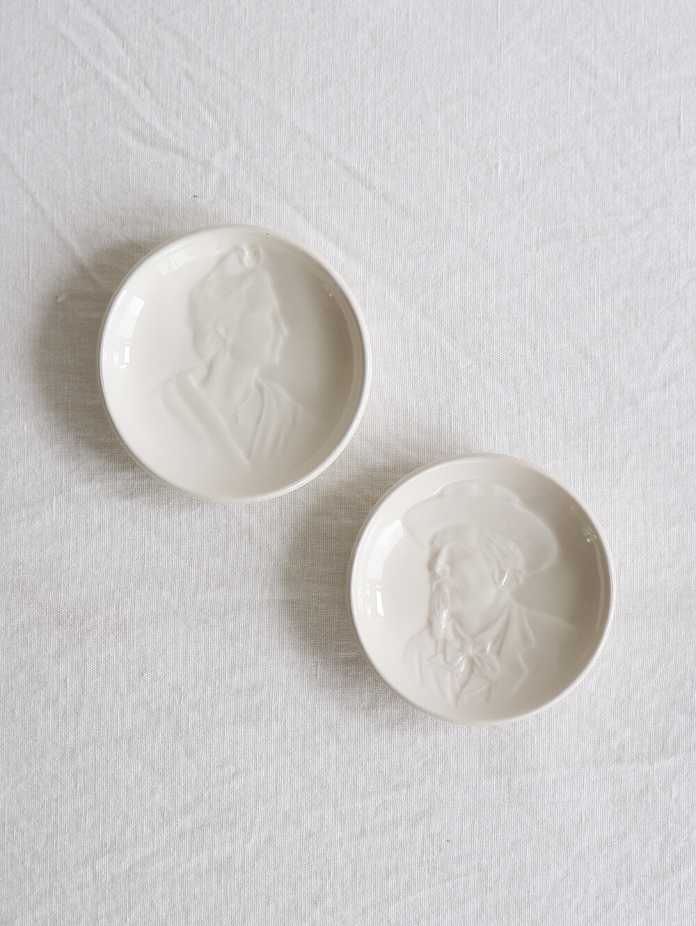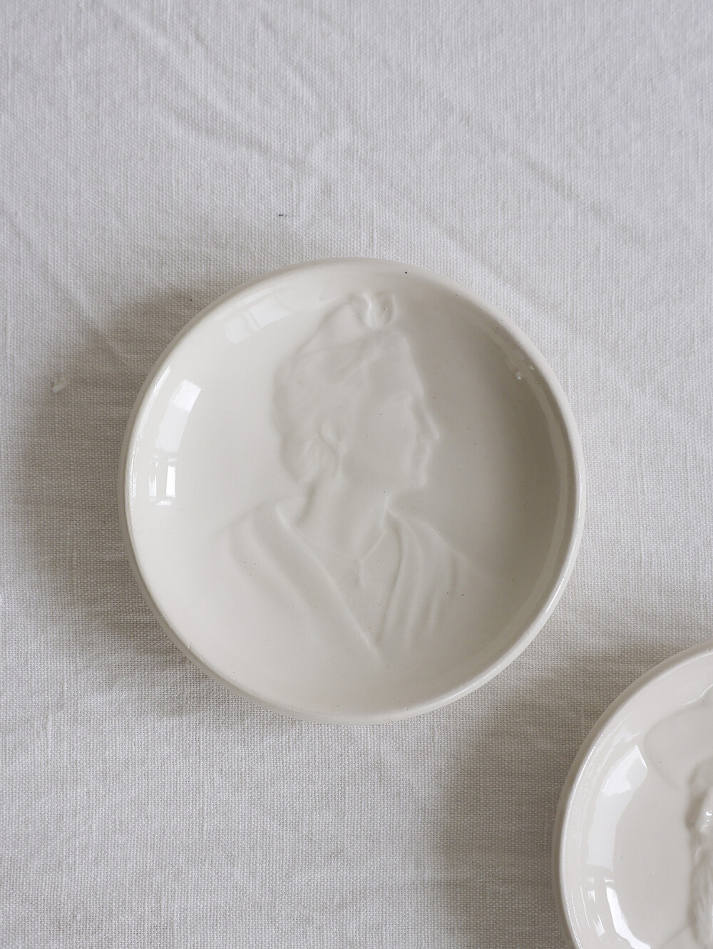 플레이트 중앙에는 각각 남성과 여성의 옆모습이 섬세한 양각으로 표현되어 있으며,