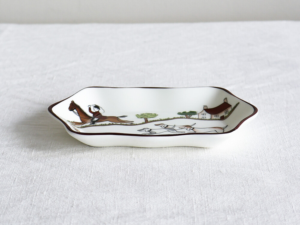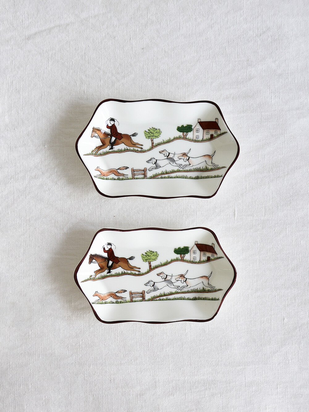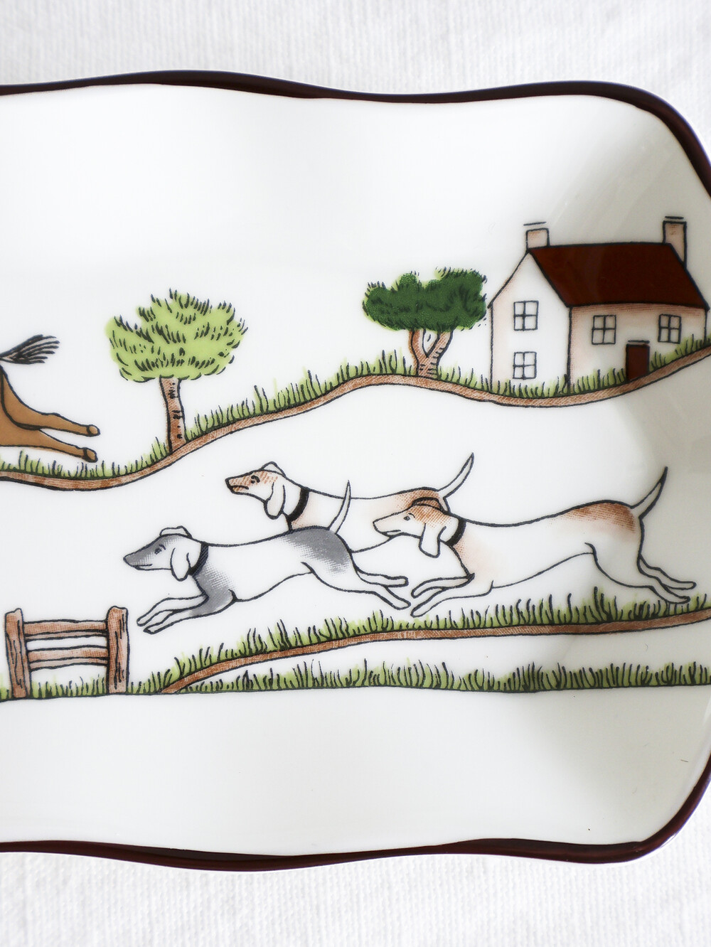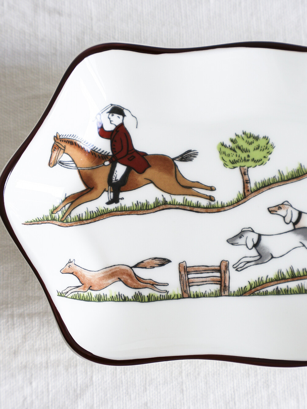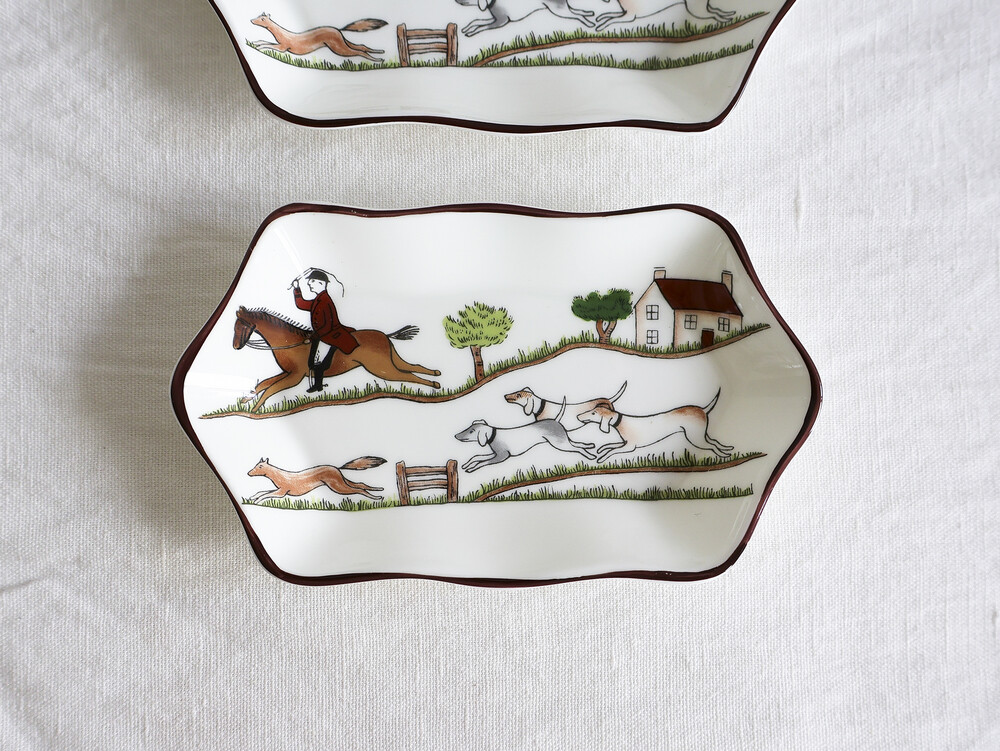 영국 시골의 여유로운 풍경 속 여우 사냥 장면이 유쾌하게 그려진 이 빈티지 플레이트는