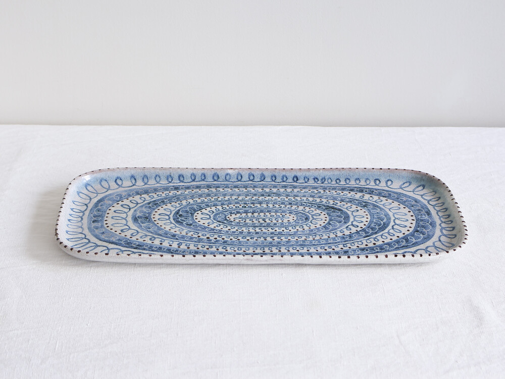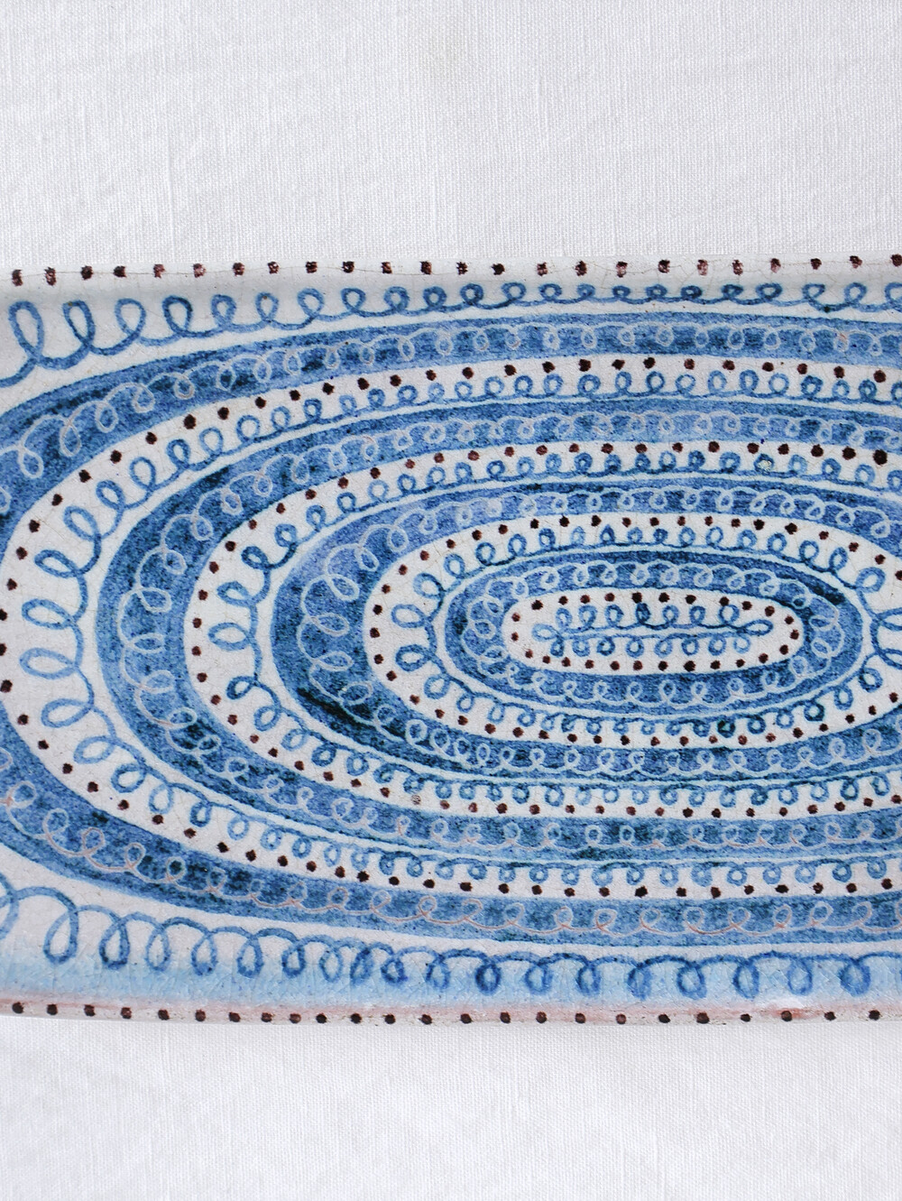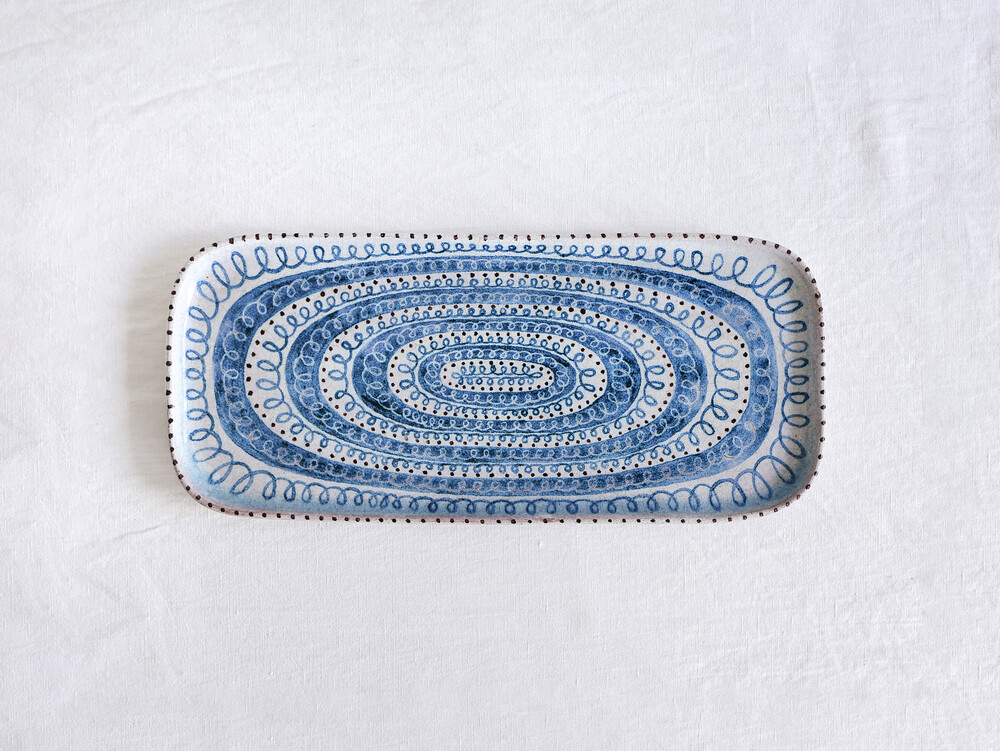 부드러운 직사각형 형태의 접시 위에핸드페인팅 특유의 유려한 블루 나선 패턴이 가득 채워져 있어단순하면서도 예술적인 분위기를 자아냅니다.