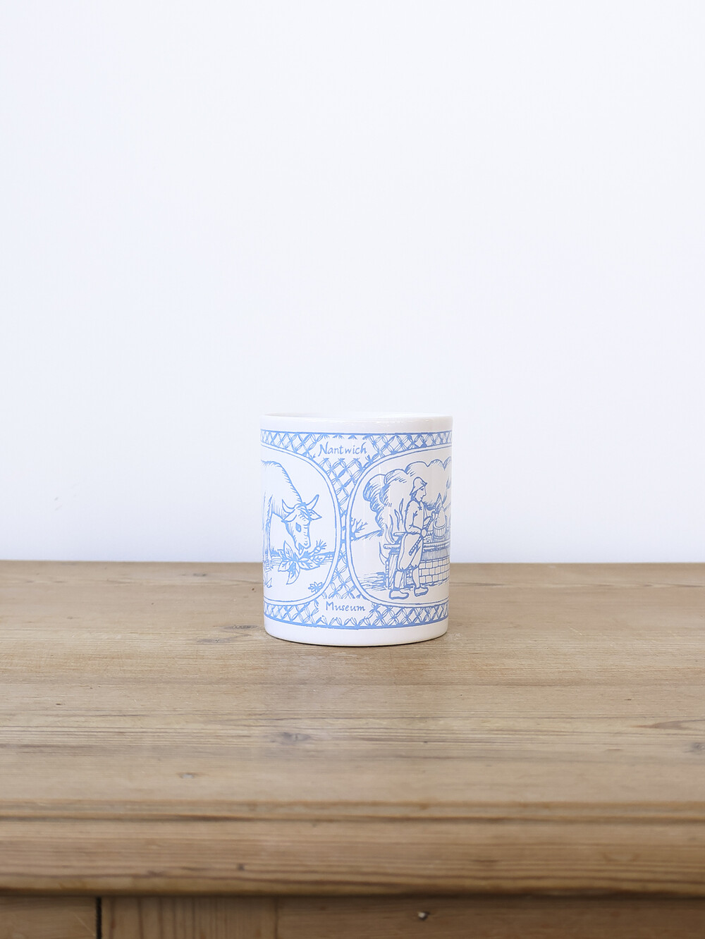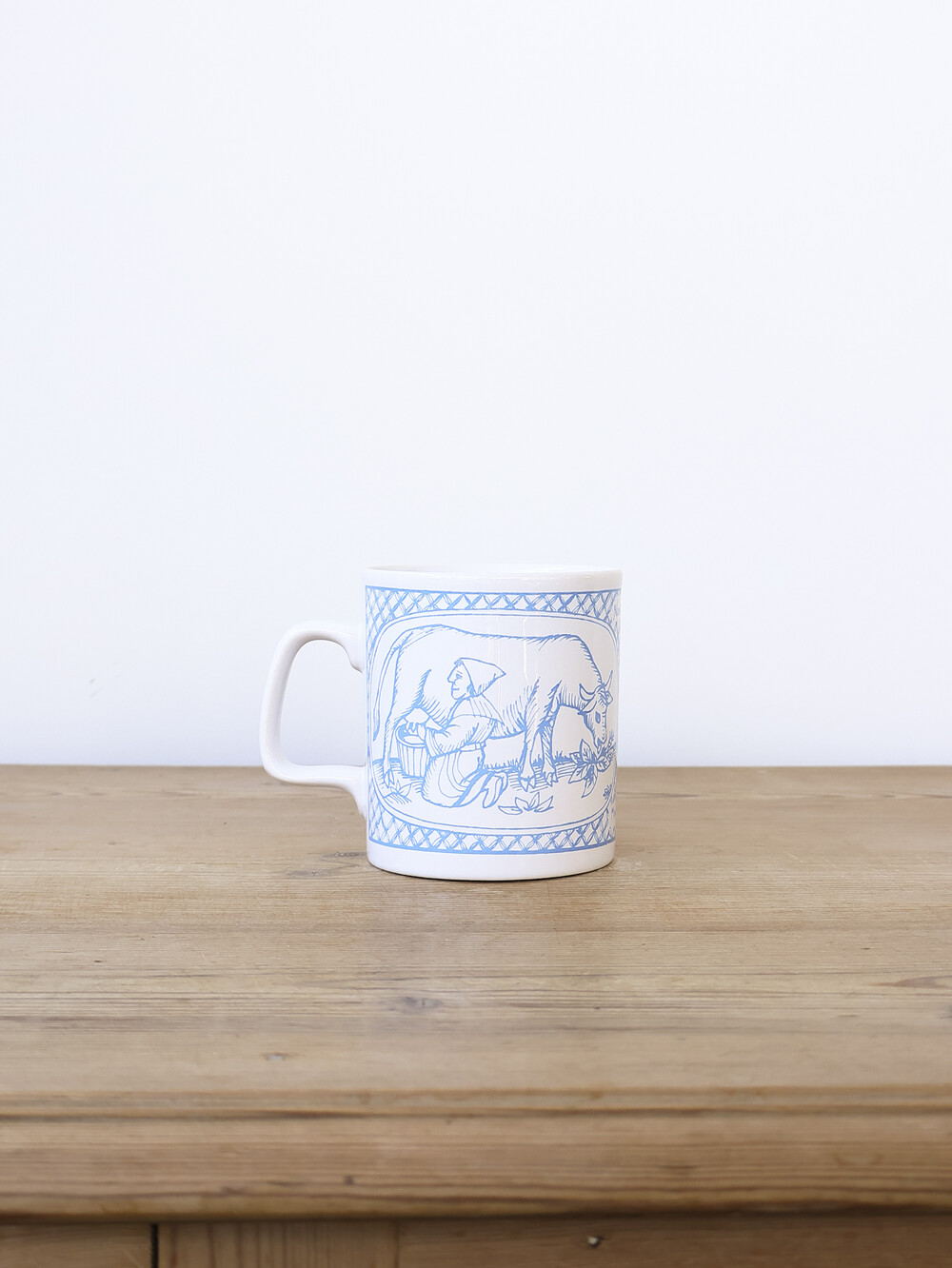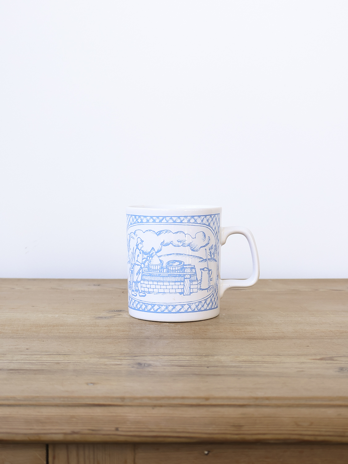 블루 컬러의 섬세한 선화로 표현된 장면은 목축과 일상의 풍경을 차분하게 그려내며, 머그 상·하단을 감싸는 장식 패턴이 클래식한 균형감을 더합니다.