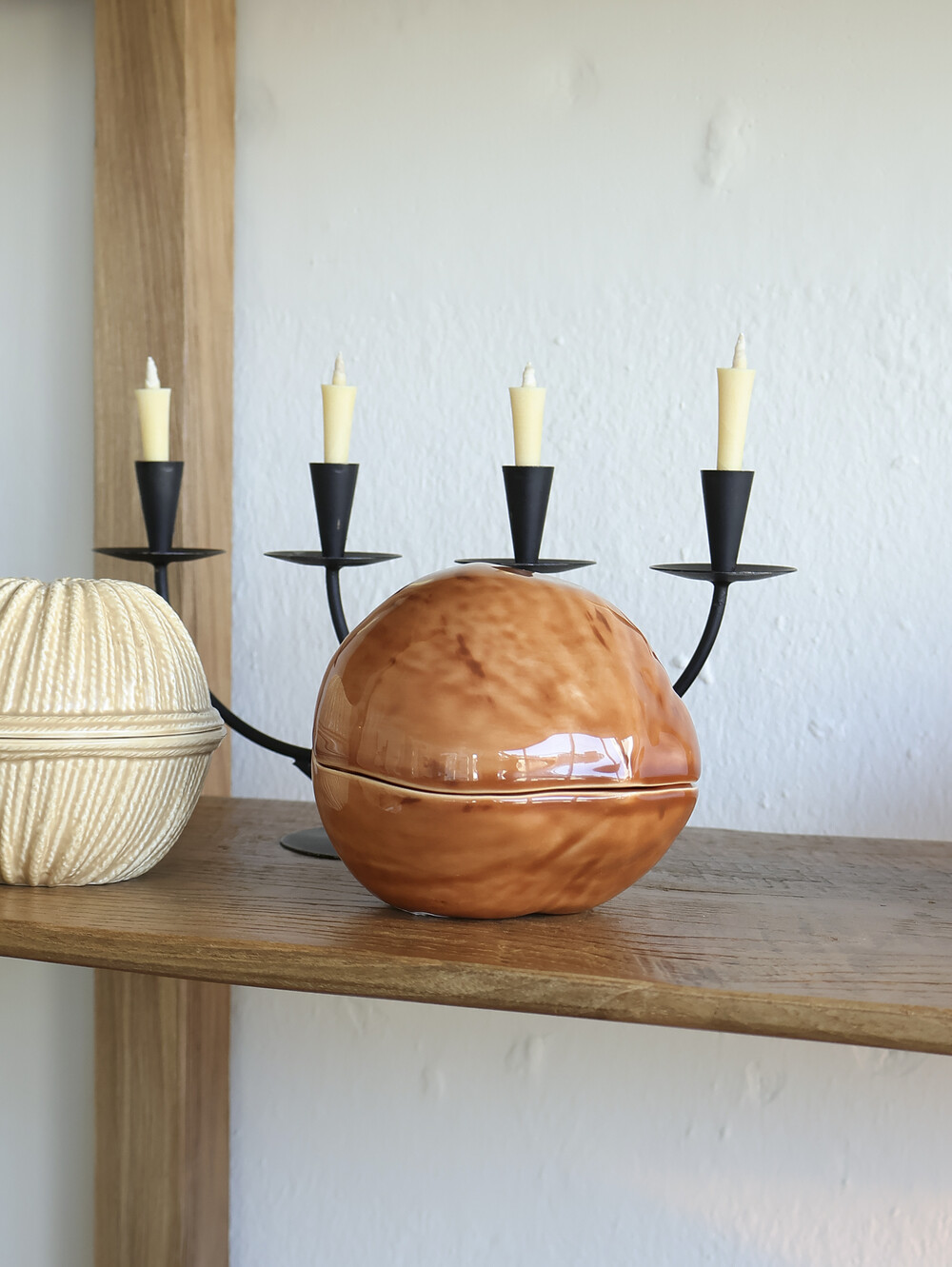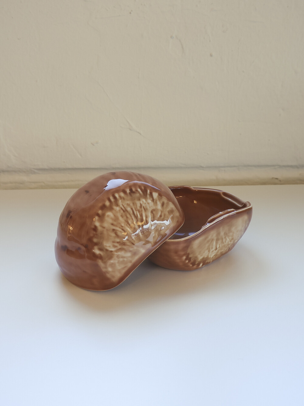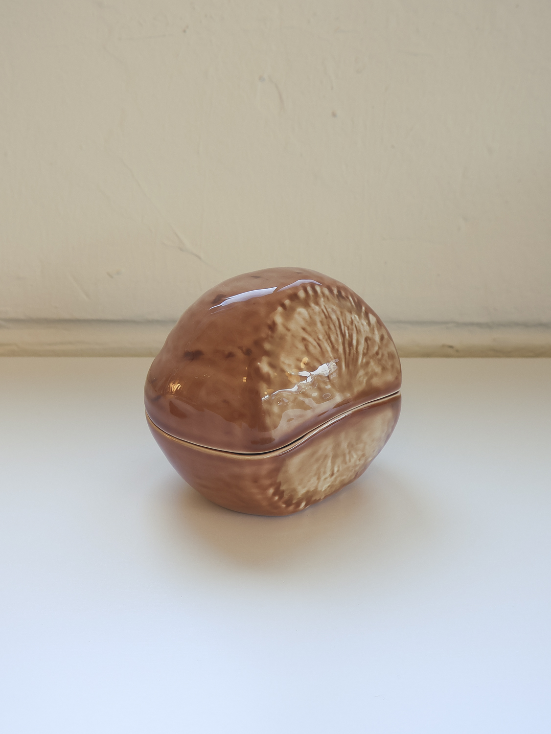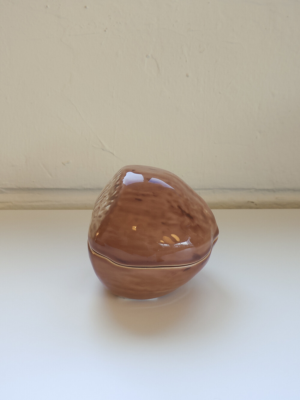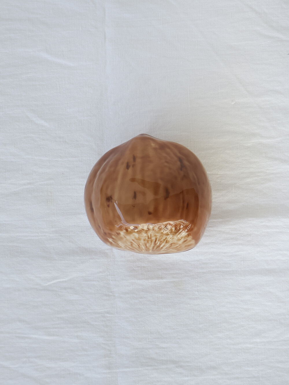 이 제품은 헤이즐넛를 연상시키는 유기적인 형태의 세라믹 보관함으로, 위아래가 분리되는 뚜껑 구조를 가지고 있습니다. 실제 자연물의 질감과 볼륨을 살린 조형이 특징이며, 닫아두었을 때는 하나의 오브제처럼 완성도 높은 실루엣을 보여줍니다.