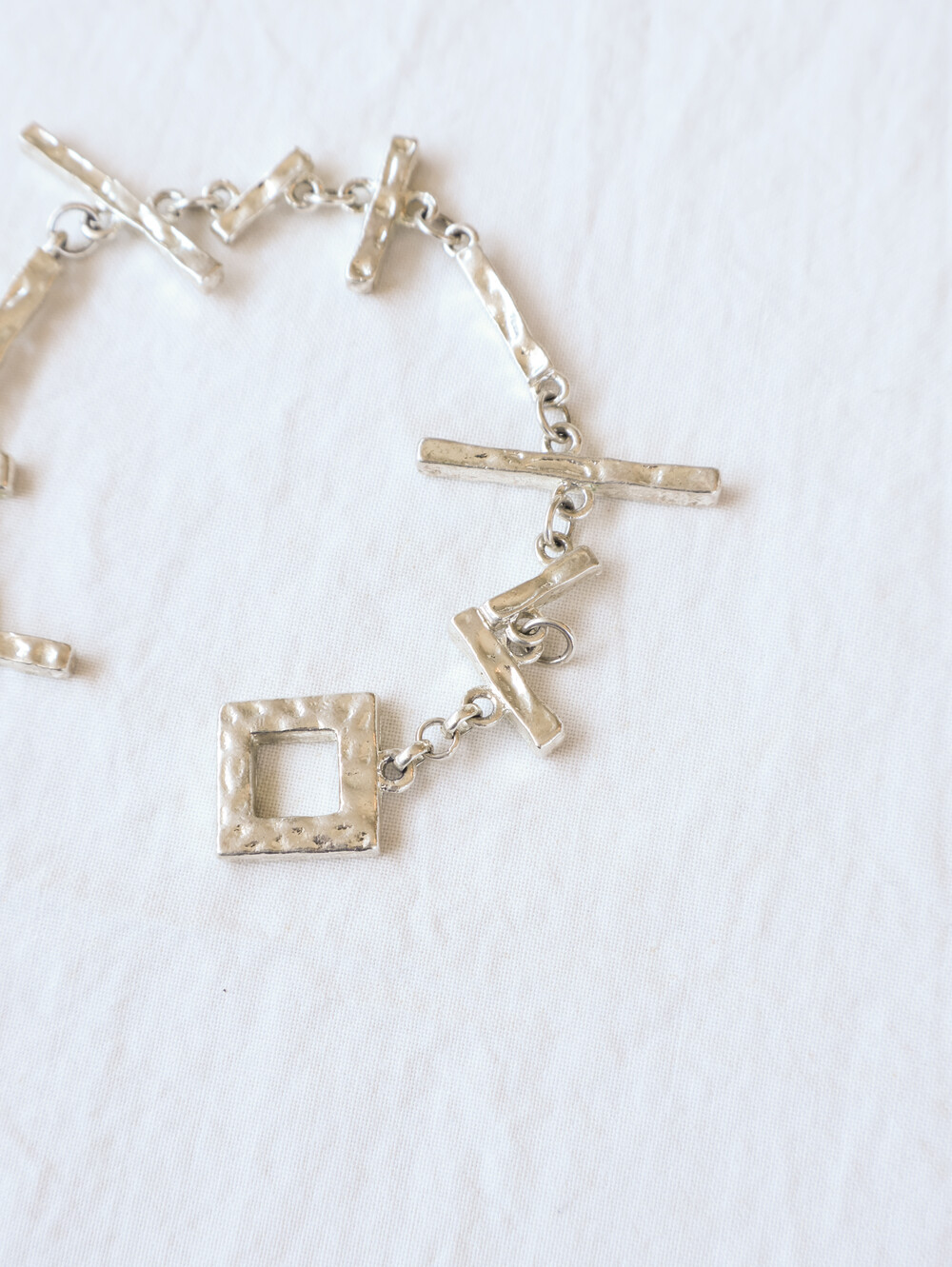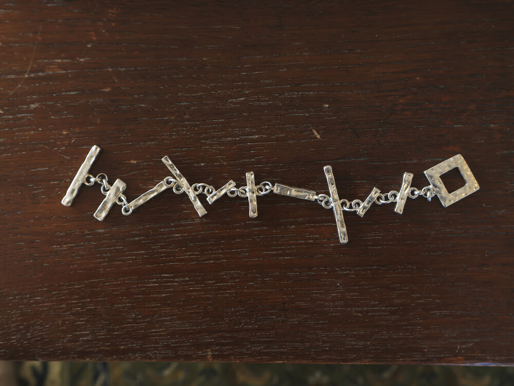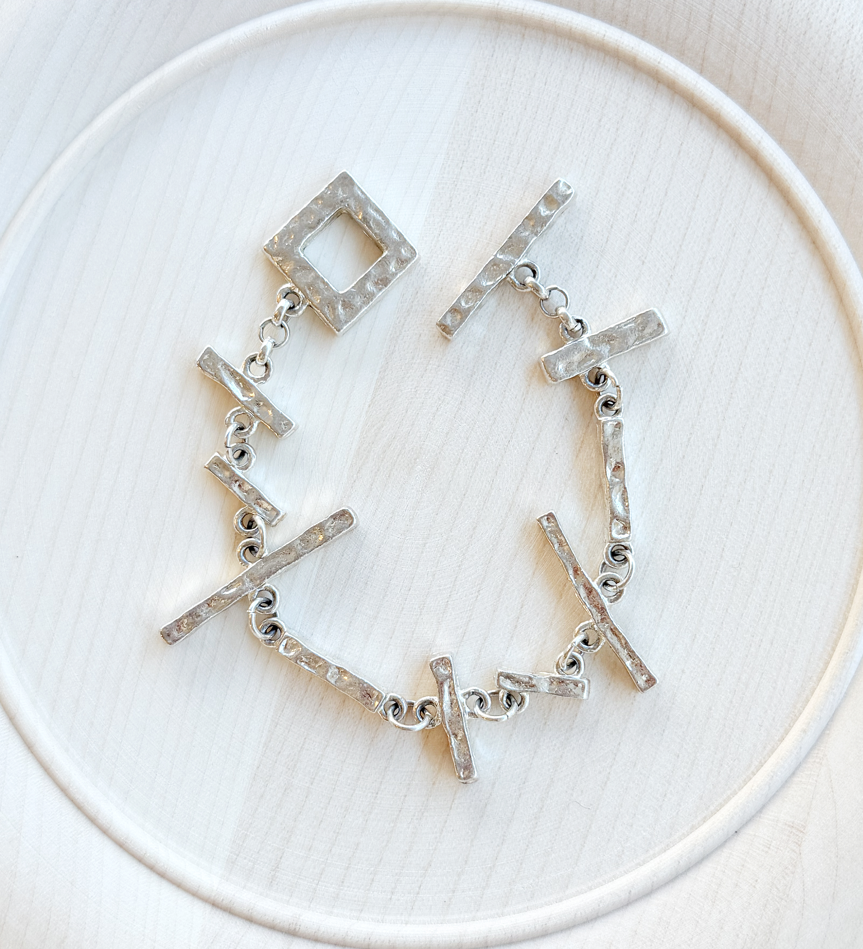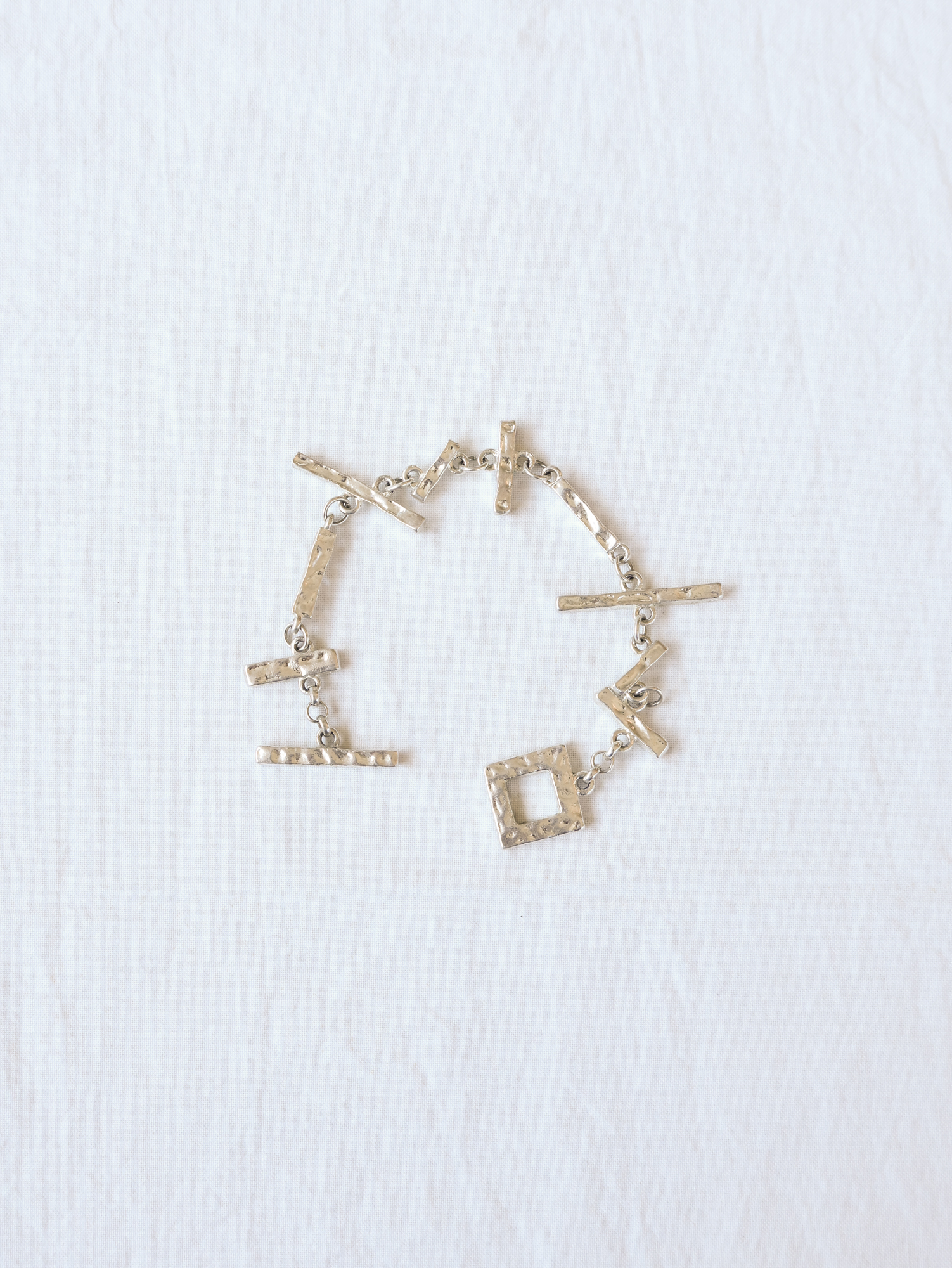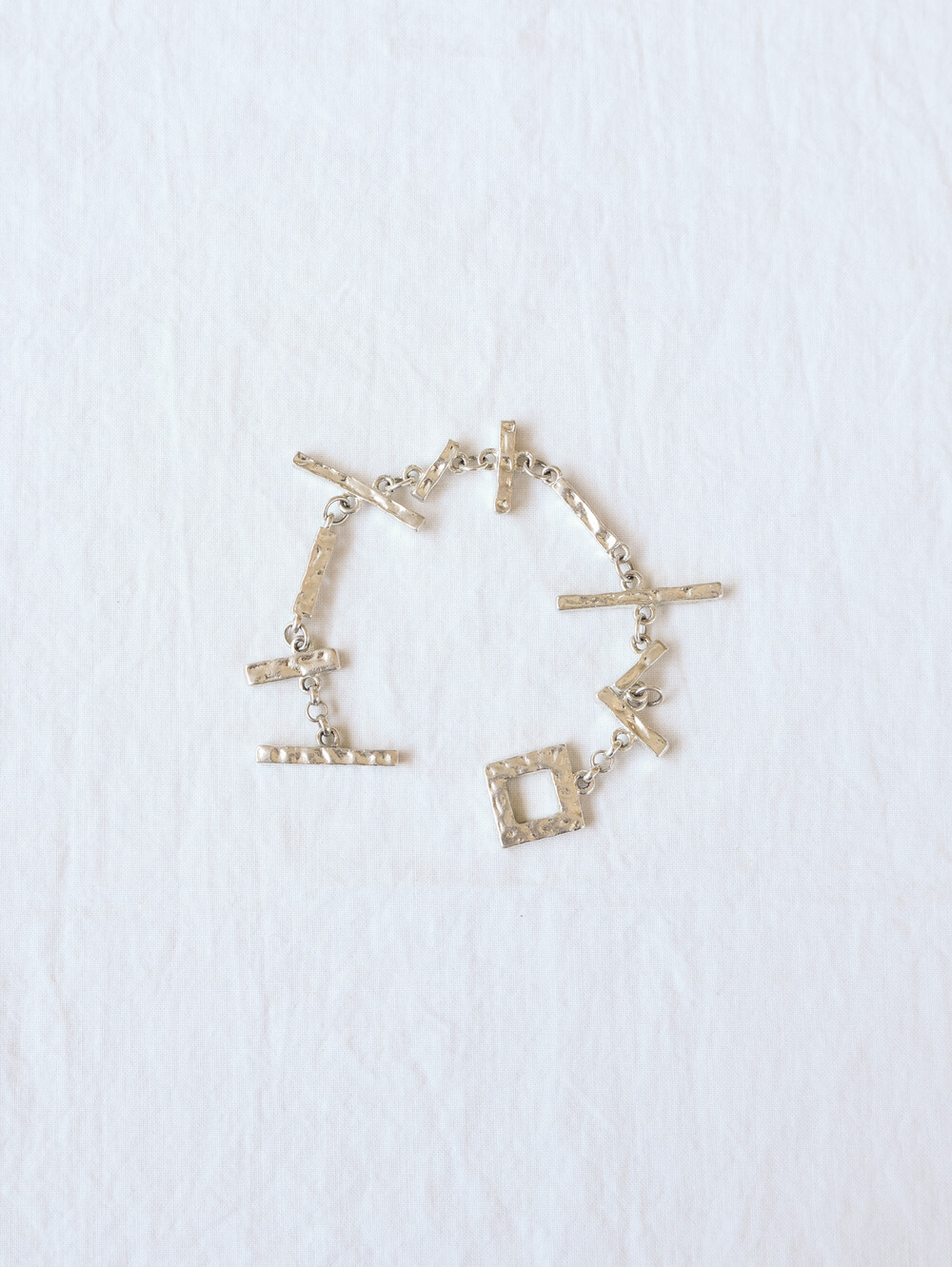 이 브레이슬릿은 해머드 텍스처가 살아 있는 바 형태와 스퀘어 모티프가 체인 위에 불규칙하게 연결된 디자인으로,