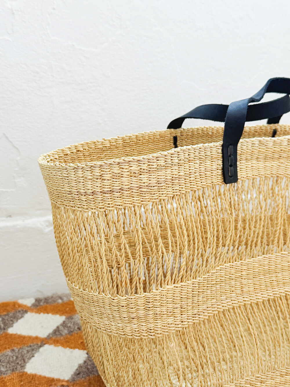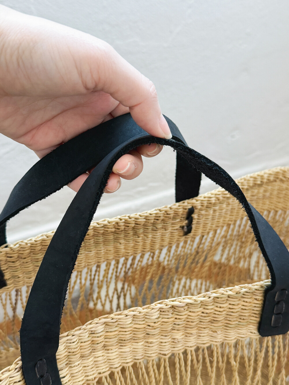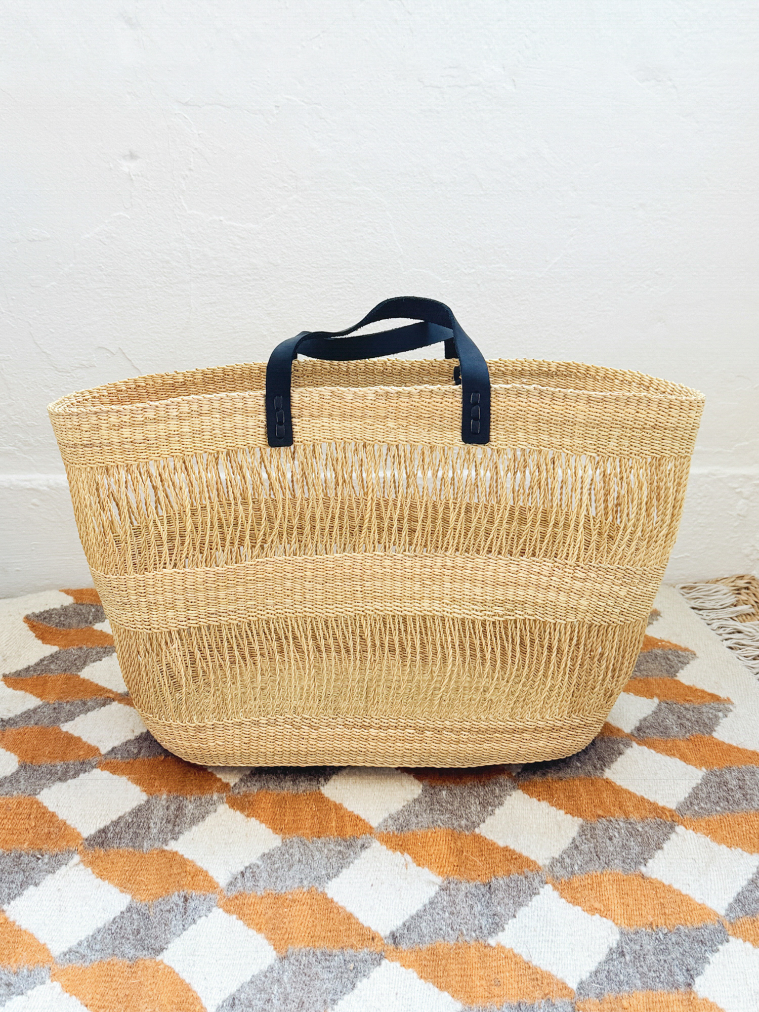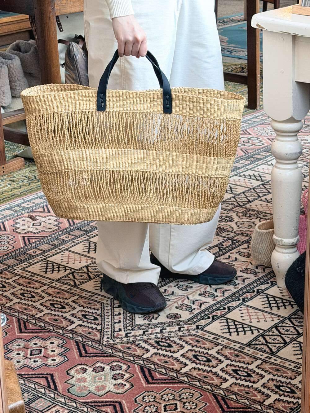 베타 베라(Beta Vera)라 불리는 엘리펀트 그래스(Elephant Grass)를 정성스럽게 엮고, 가죽 핸들을 더해 완성한 카고 백입니다.